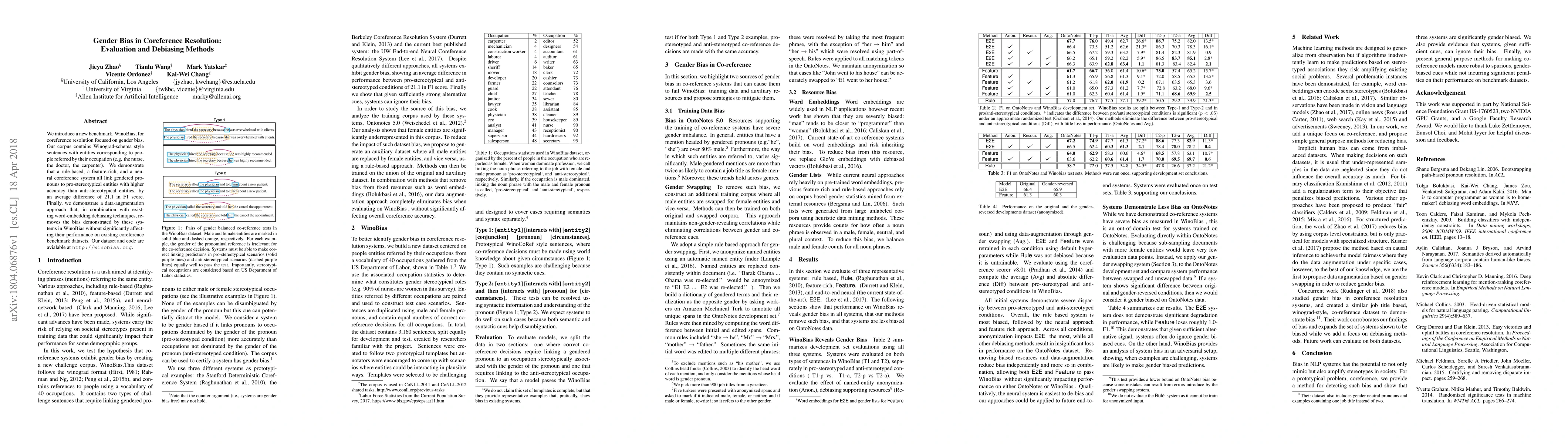 This paper introduces WinoBias, a benchmark for evaluating gender bias in coreference resolution, showing that various systems exhibit higher accuracy in linking gendered pronouns to stereotypical roles. It also proposes a data-augmentation method combined with debiasing techniques to mitigate this bias without compromising performance on standard benchmarks.
