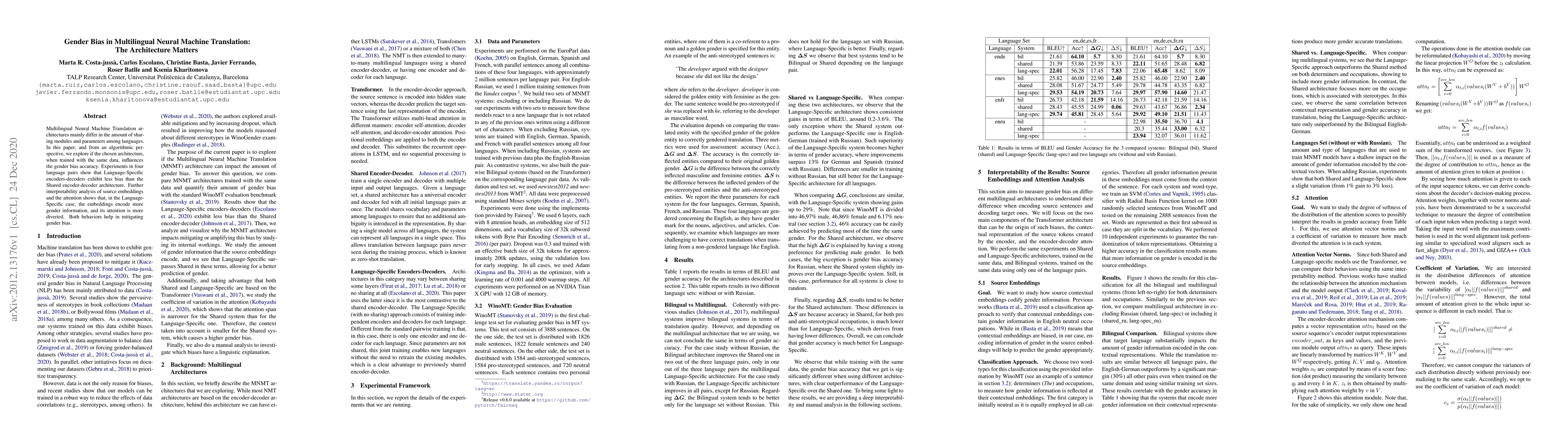 Multilingual Neural Machine Translation architectures mainly differ in the amount of sharing modules and parameters among languages. In this paper, and from an algorithmic perspective, we explore if the chosen architecture, when trained with the same data, influences the gender bias accuracy. Experiments in four language pairs show that Language-Specific encoders-decoders exhibit less bias than the Shared encoder-decoder architecture. Further interpretability analysis of source embeddings and the attention shows that, in the Language-Specific case, the embeddings encode more gender information, and its attention is more diverted. Both behaviors help in mitigating gender bias.