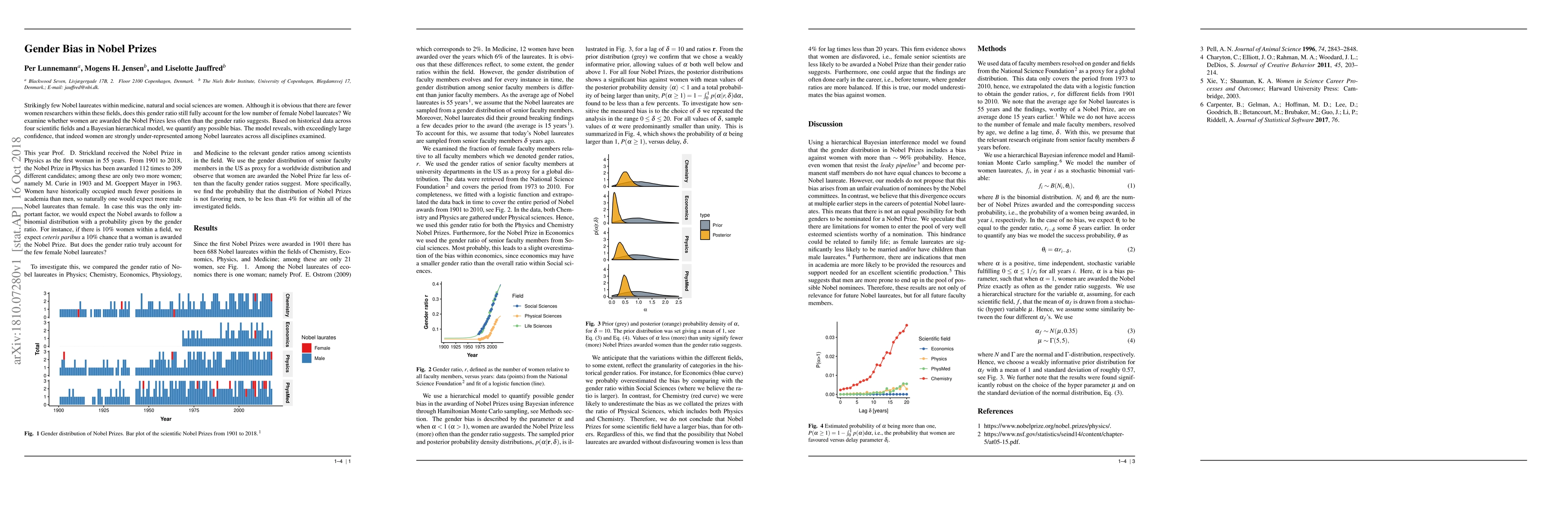 The paper investigates gender bias in Nobel Prize awards, finding that women are significantly under-represented despite proportionally fewer female researchers in the fields. Using a Bayesian hierarchical model, it concludes that gender bias plays a substantial role in the low number of female laureates.