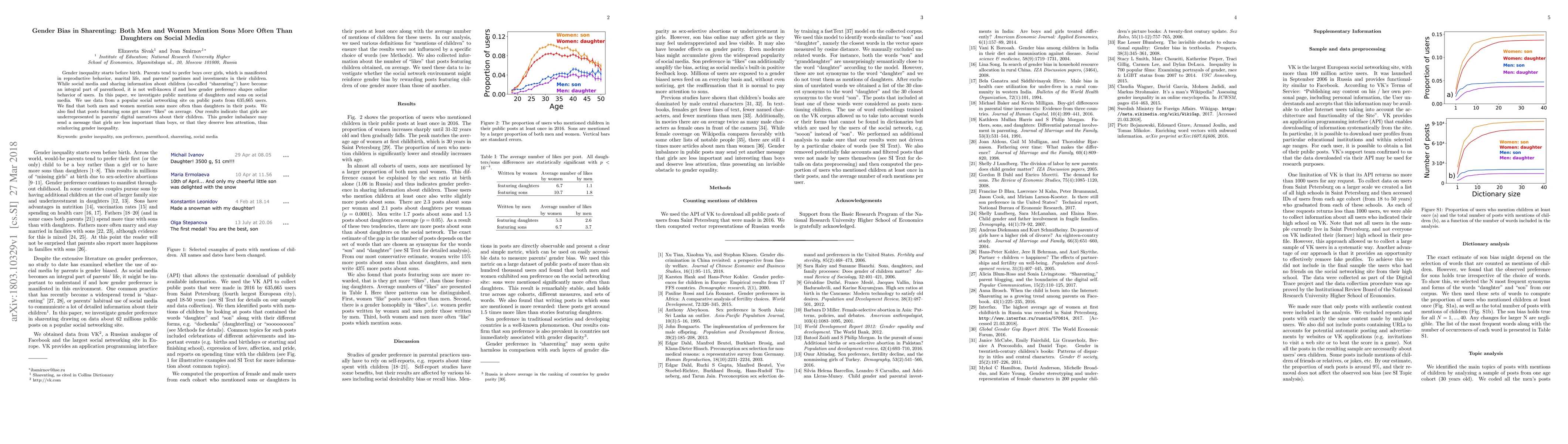 Gender inequality starts before birth. Parents tend to prefer boys over girls, which is manifested in reproductive behavior, marital life, and parents' pastimes and investments in their children. While social media and sharing information about children (so-called "sharenting") have become an integral part of parenthood, it is not well-known if and how gender preference shapes online behavior of users. In this paper, we investigate public mentions of daughters and sons on social media. We use data from a popular social networking site on public posts from 635,665 users. We find that both men and women mention sons more often than daughters in their posts. We also find that posts featuring sons get more "likes" on average. Our results indicate that girls are underrepresented in parents' digital narratives about their children. This gender imbalance may send a message that girls are less important than boys, or that they deserve less attention, thus reinforcing gender inequality.