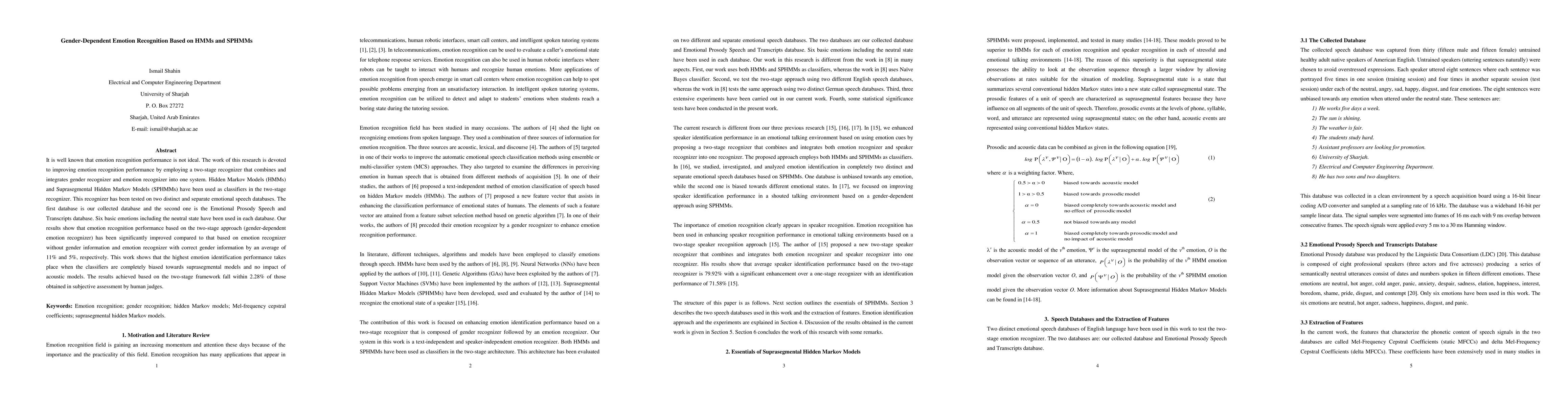 This research improves emotion recognition by using a two-stage system combining gender and emotion recognition, employing HMMs and SPHMMs. Results show a significant 11% improvement over traditional emotion recognizers, highlighting the effectiveness of gender-based approaches.