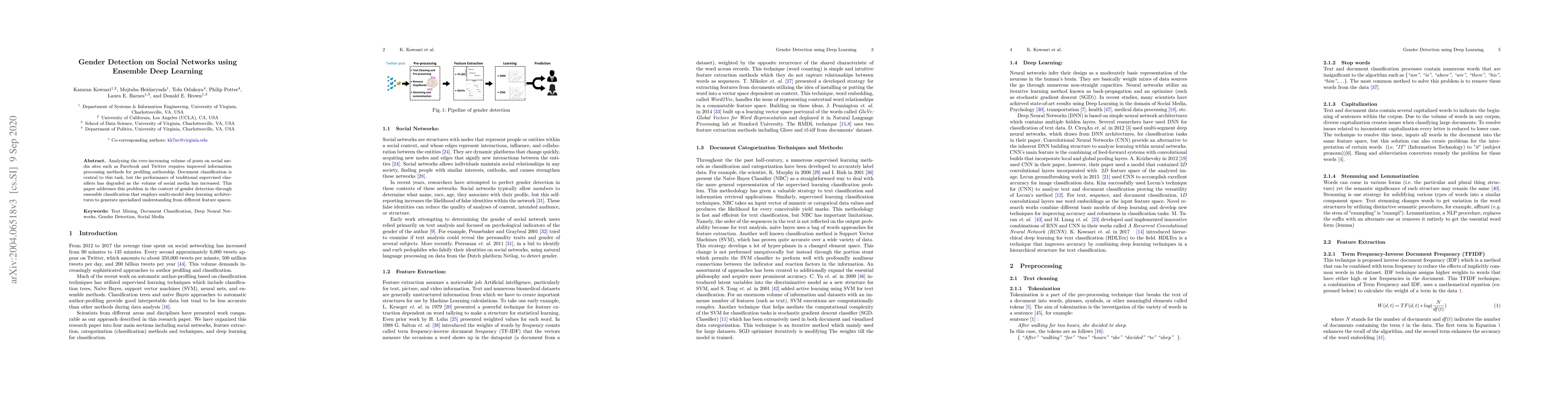 Analyzing the ever-increasing volume of posts on social media sites such as Facebook and Twitter requires improved information processing methods for profiling authorship. Document classification is central to this task, but the performance of traditional supervised classifiers has degraded as the volume of social media has increased. This paper addresses this problem in the context of gender detection through ensemble classification that employs multi-model deep learning architectures to generate specialized understanding from different feature spaces.