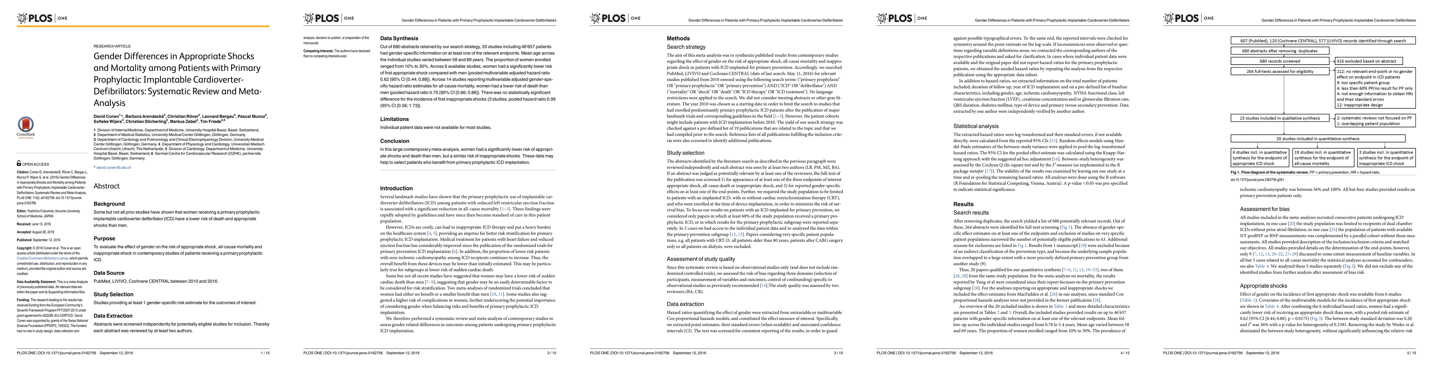 BACKGROUND: Some but not all prior studies have shown that women receiving a primary prophylactic implantable cardioverter defibrillator (ICD) have a lower risk of death and appropriate shocks than men. PURPOSE: To evaluate the effect of gender on the risk of appropriate shock, all-cause mortality and inappropriate shock in contemporary studies of patients receiving a primary prophylactic ICD. DATA SOURCE: PubMed, LIVIVO, Cochrane CENTRAL between 2010 and 2016. STUDY SELECTION: Studies providing at least 1 gender-specific risk estimate for the outcomes of interest. DATA EXTRACTION: Abstracts were screened independently for potentially eligible studies for inclusion. Thereby each abstract was reviewed by at least two authors. DATA SYNTHESIS: Out of 680 abstracts retained by our search strategy, 20 studies including 46'657 patients had gender-specific information on at least one of the relevant endpoints. Mean age across the individual studies varied between 58 and 69 years. The proportion of women enrolled ranged from 10% to 30%. Across 6 available studies, women had a significantly lower risk of first appropriate shock compared with men (pooled multivariable adjusted hazard ratio 0.62 (95% CI [0.44; 0.88]). Across 14 studies reporting multivariable adjusted gender-specific hazard ratio estimates for all-cause mortality, women had a lower risk of death than men (pooled hazard ratio 0.75 (95% CI [0.66; 0.86]). There was no statistically significant difference for the incidence of first inappropriate shocks (3 studies, pooled hazard ratio 0.99 (95% CI [0.56; 1.73]). CONCLUSION: In this large contemporary meta-analysis, women had a significantly lower risk of appropriate shocks and death than men, but a similar risk of inappropriate shocks. These data may help to select patients who benefit from primary prophylactic ICD implantation.