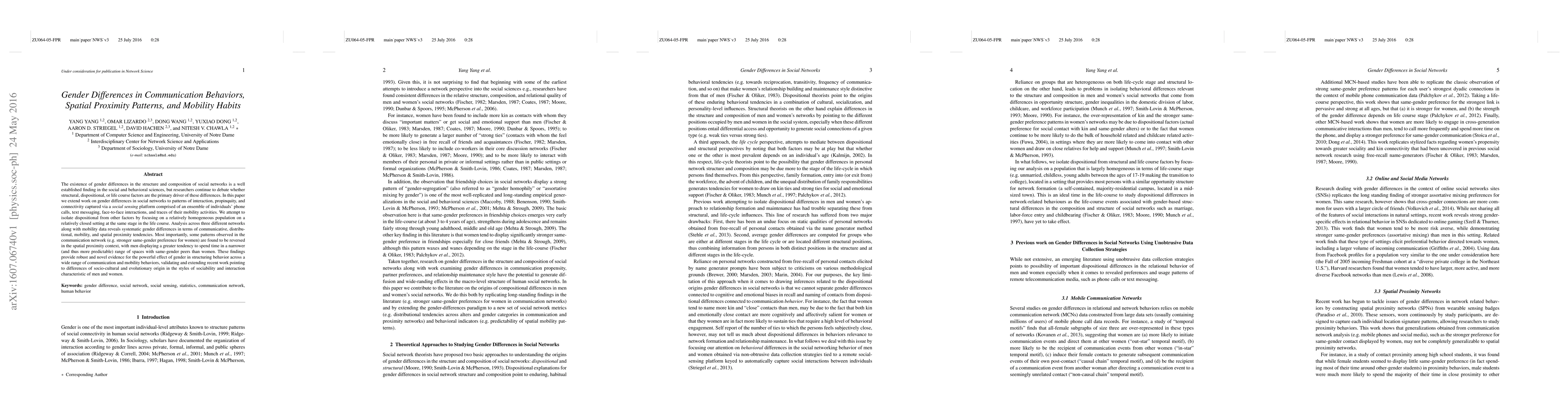 The existence of gender differences in the structure and composition of social networks is a well established finding in the social and behavioral sciences, but researchers continue to debate whether structural, dispositional, or life course factors are the primary driver of these differences. In this paper we extend work on gender differences in social networks to patterns of interaction, propinquity, and connectivity captured via a social sensing platform comprised of an ensemble of individuals' phone calls, text messaging, face-to-face interactions, and traces of their mobility activities. We attempt to isolate dispositional from other factors by focusing on a relatively homogeneous population on a relatively closed setting at the same stage in the life course. Analysis across three different networks along with mobility data reveals systematic gender differences in terms of communicative, distributional, mobility, and spatial proximity tendencies. Most importantly, some patterns observed in the communication network (e.g. stronger same-gender preference for women) are found to be reversed in the spatial proximity context, with men displaying a greater tendency to spend time in a narrower (and thus more predictable) range of spaces with same-gender peers than women. These findings provide robust and novel evidence for the powerful effect of gender in structuring behavior across a wide range of communication and mobility behaviors, validating and extending recent work pointing to differences of socio-cultural and evolutionary origin in the styles of sociability and interaction characteristic of men and women.