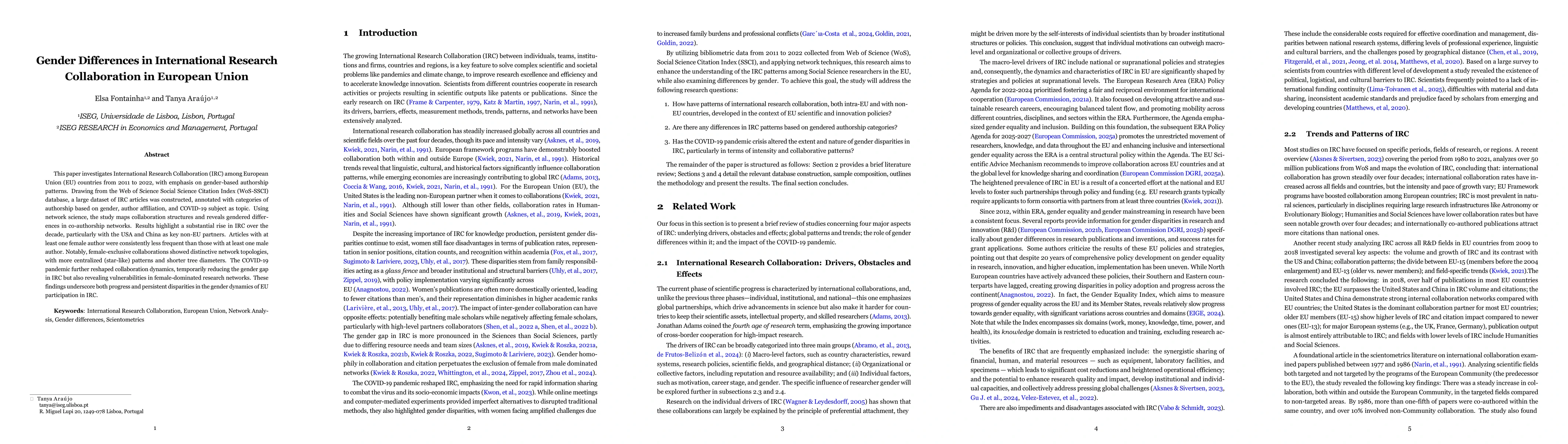 This study examines gender differences in international research collaboration among EU countries from 2011-2022, using data from the Web of Science Social Science Citation Index. It found a significant increase in collaborations, especially with the USA and China. Female authorship was less common, but female-exclusive collaborations showed distinct network patterns. The COVID-19 pandemic temporarily reduced gender gaps but exposed vulnerabilities in female-dominated networks, highlighting both progress and persisting disparities in EU gender dynamics in research collaboration.