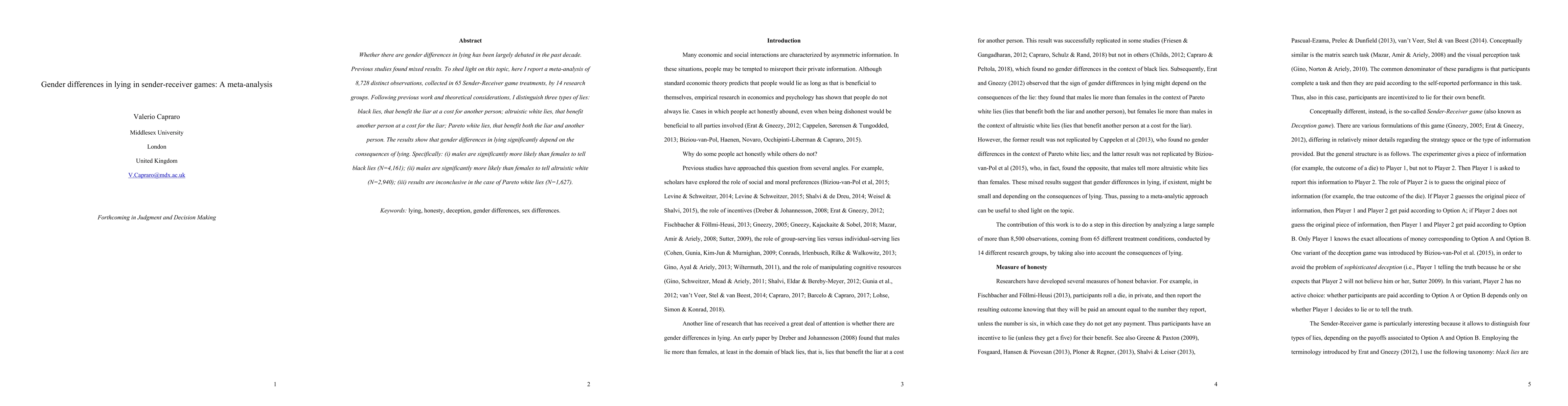This meta-analysis of 8,728 observations across 65 Sender-Receiver game treatments reveals that males are more likely than females to tell black and altruistic white lies, while results are inconclusive for Pareto white lies. Gender differences in lying are context-dependent, varying with the consequences of the lie.