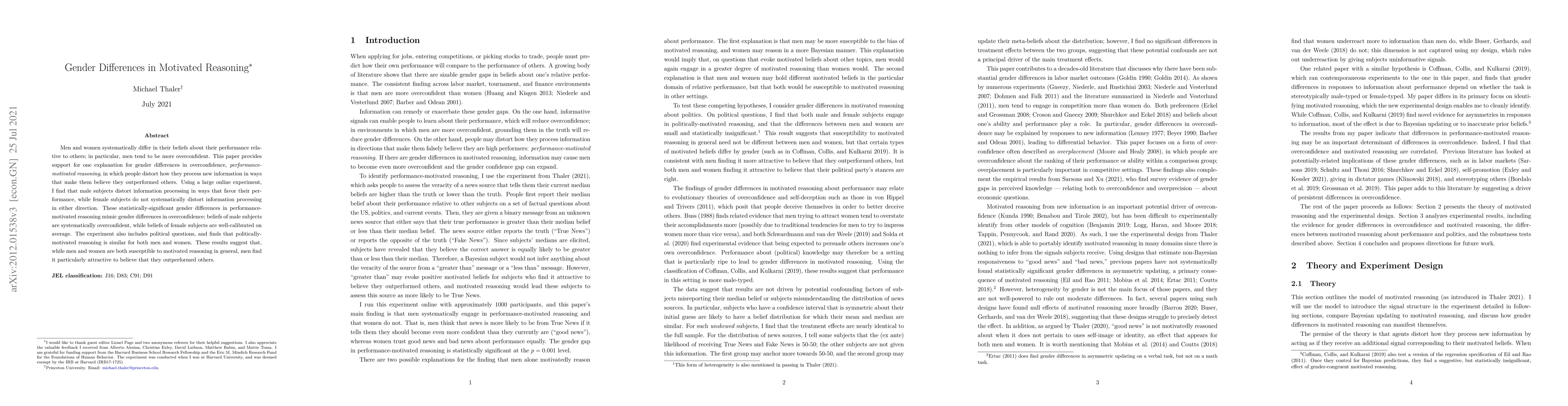 This research finds that men exhibit performance-motivated reasoning, distorting information processing to believe they outperform others, leading to overconfidence, while women do not show such systematic distortion. Politically-motivated reasoning is similar for both genders.