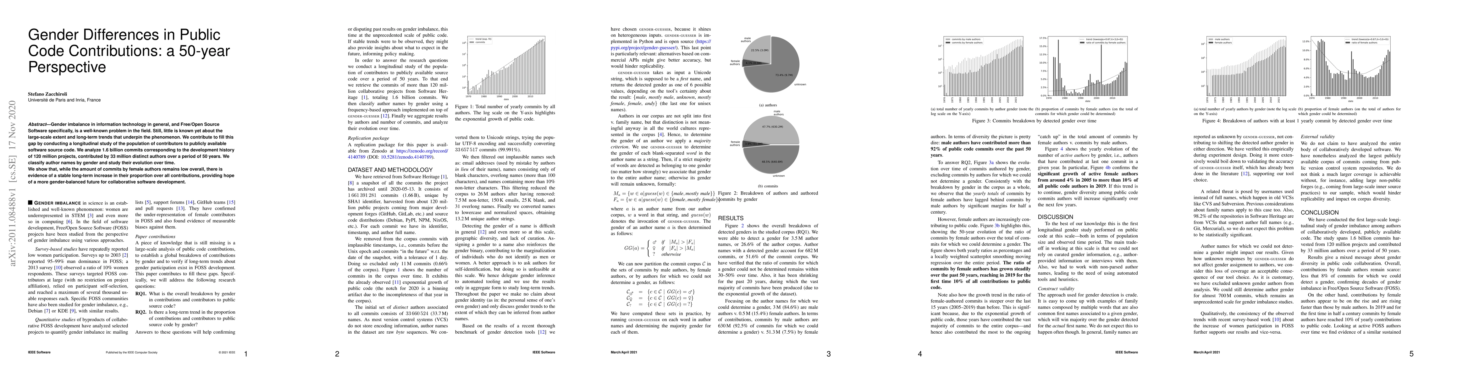 A 50-year study of public code contributions found a stable long-term increase in female authors' proportion, suggesting hope for a more gender-balanced future in collaborative software development.