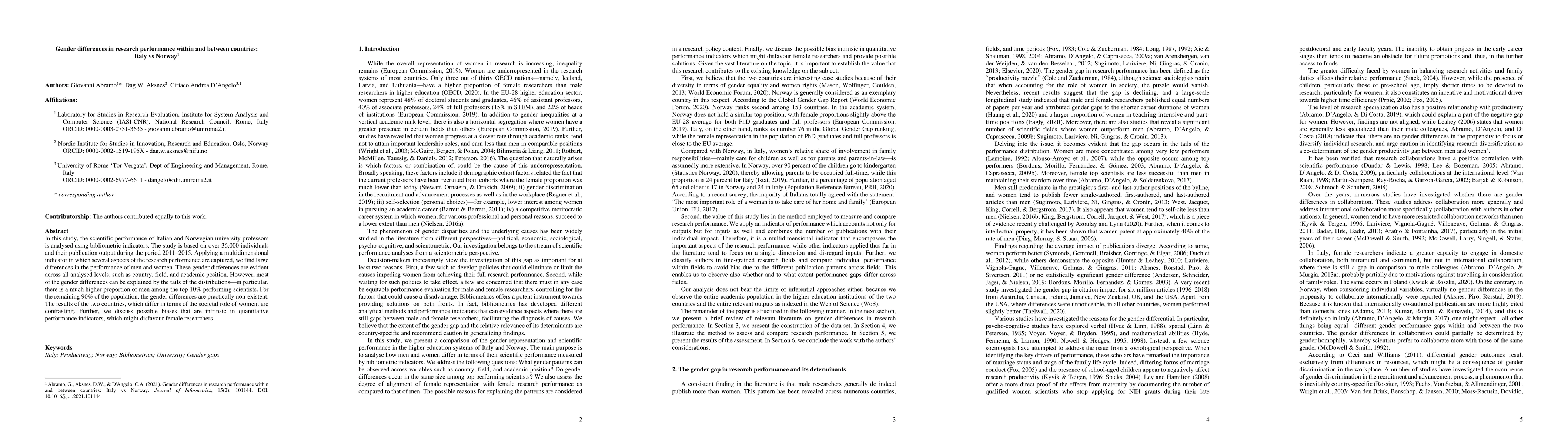 This study analyzes gender differences in research performance among Italian and Norwegian university professors using bibliometric indicators, revealing significant disparities in the top 10% of performers, with men dominating, while the remaining 90% show negligible gender differences. The contrasting societal roles of women in the two countries highlight potential biases in performance metrics.