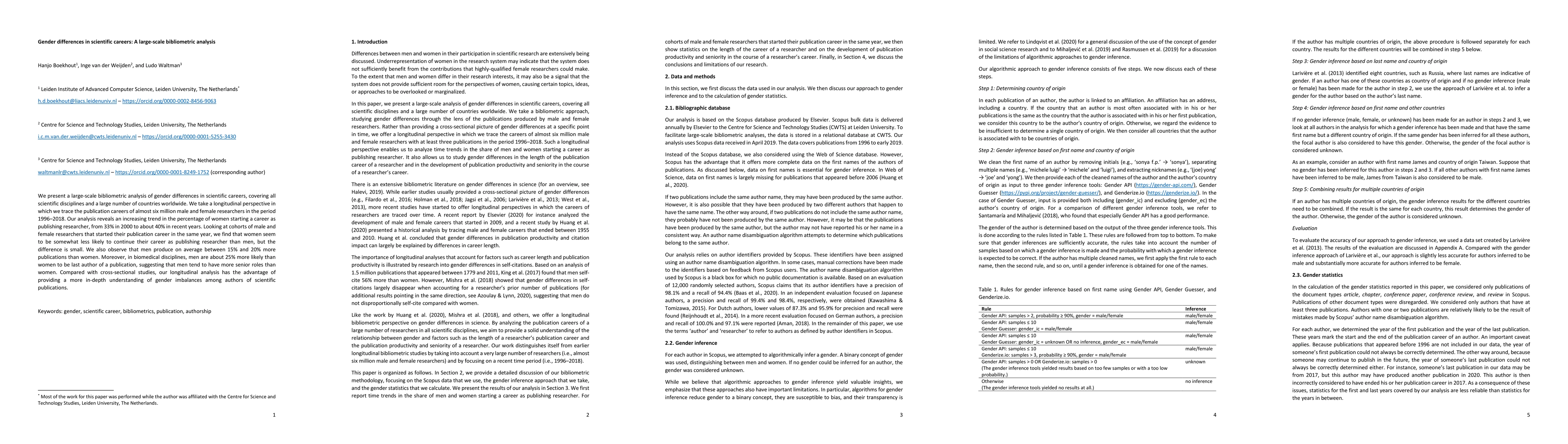 This study conducts a large-scale bibliometric analysis of gender differences in scientific careers, revealing an increasing trend of women starting research careers and a small disparity in career continuation rates between genders. Men produce more publications and hold senior roles more frequently, especially in biomedical fields.