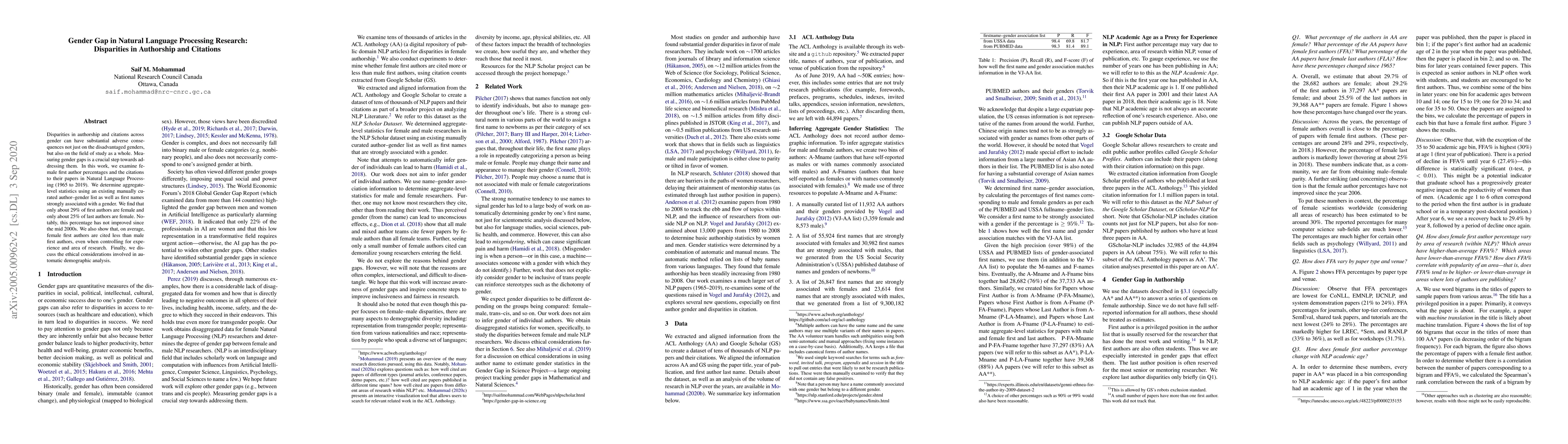 This study investigates gender disparities in authorship and citations in Natural Language Processing research from 1965 to 2019, finding that only 29% of first authors and 25% of last authors are female, with no significant improvement since the mid-2000s. Female first authors also receive fewer citations on average, highlighting a persistent gender gap in the field.