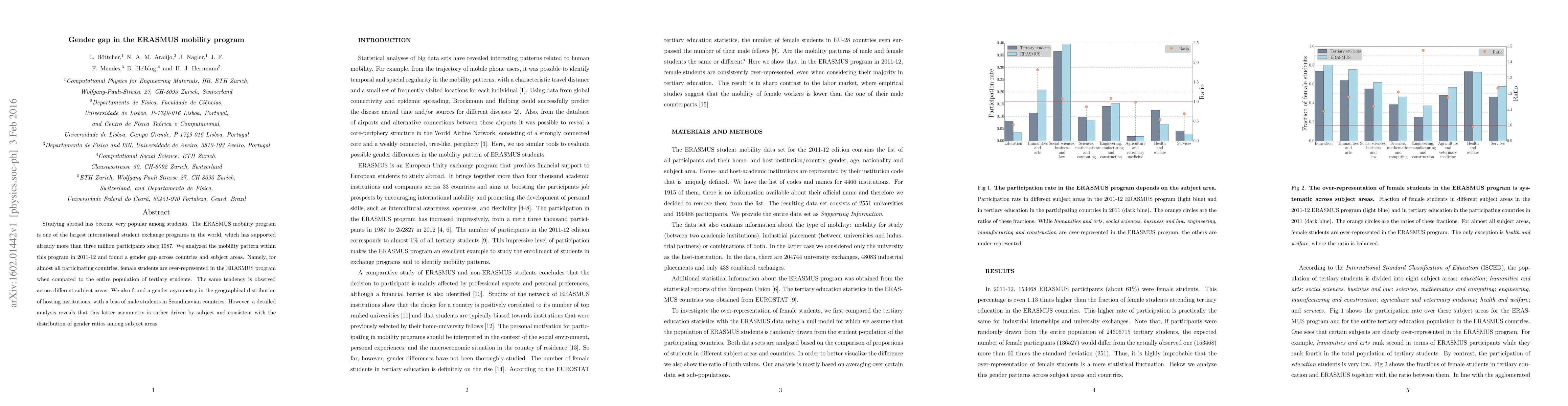 A study found a gender gap in the ERASMUS mobility program, with female students over-represented globally and subject-wise, while male students were more likely to host in Scandinavian countries. This bias is consistent across subject areas.