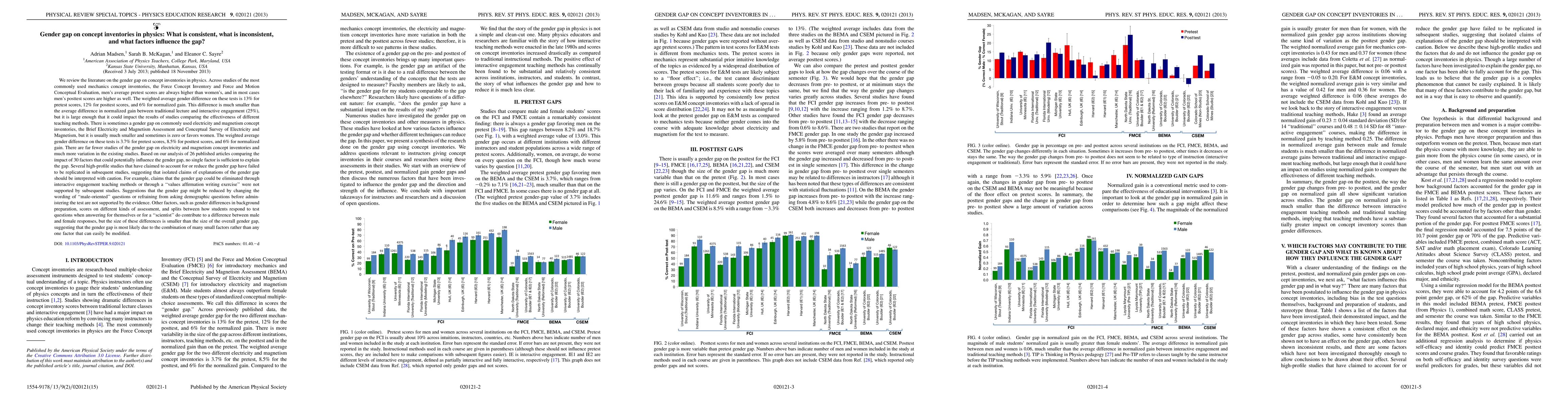This paper reviews the gender gap in physics concept inventories, finding consistent but small differences favoring men in mechanics, while gaps in electromagnetism are often negligible. No single factor fully explains the gap, and claims of specific explanations have not been consistently replicated.