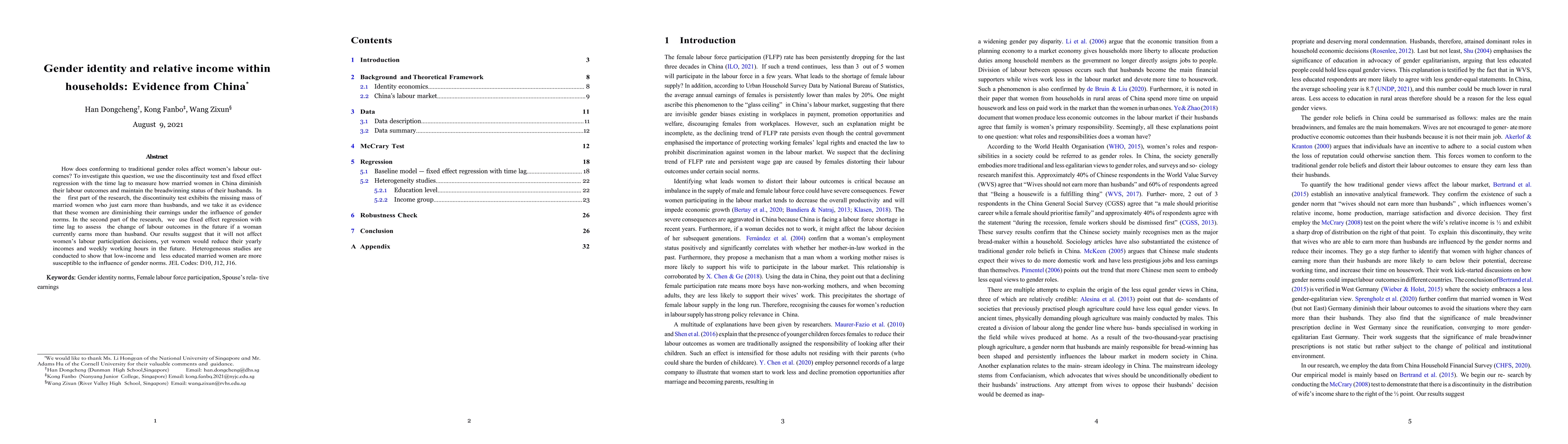 How does women's obedience to traditional gender roles affect their labour outcomes? To investigate on this question, we employ discontinuity tests and fixed effect regressions with time lag to measure how married women in China diminish their labour outcomes so as to maintain the bread-winning status of their husbands. In the first half of this research, our discontinuity test exhibits a missing mass of married women who just out-earn their husbands, which is interpreted as an evidence showing that these females diminish their earnings under the influence of gender norms. In the second half, we use fixed effect regressions with time lag to assess the change of a female's future labour outcomes if she currently earns more than her husband. Our results suggest that women's future labour participation decisions (whether they still join the workforce) are unaffected, but their yearly incomes and weekly working hours will be reduced in the future. Lastly, heterogeneous studies are conducted, showing that low-income and less educated married women are more susceptible to the influence of gender norms.