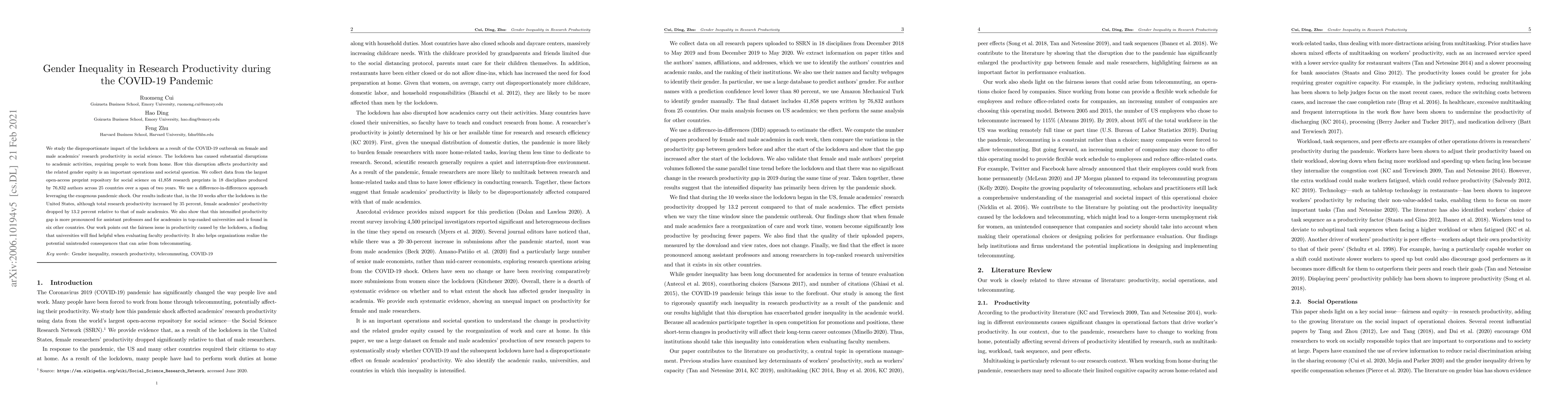 This work is notable for directly testing the impact of the pandemic shock on gender inequality in academia, revealing significant disparities in research productivity between male and female academics, especially among junior faculty and those at top-ranked universities.