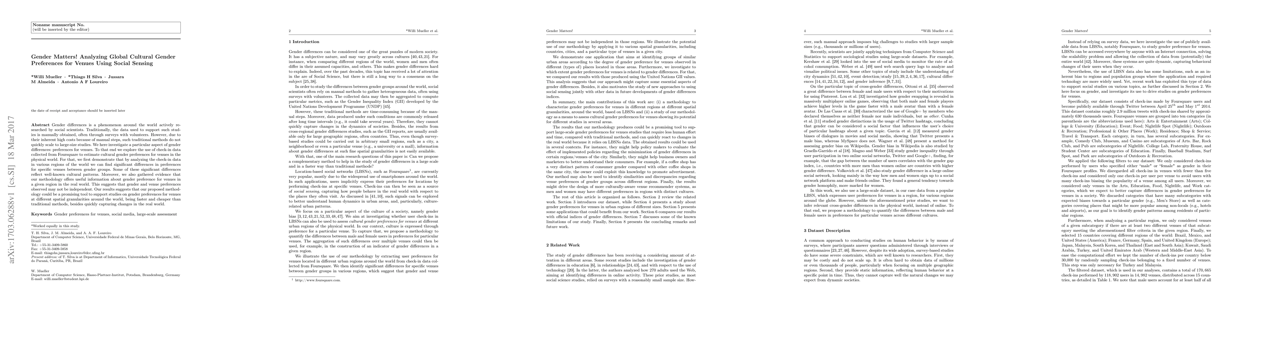 Gender differences is a phenomenon around the world actively researched by social scientists. Traditionally, the data used to support such studies is manually obtained, often through surveys with volunteers. However, due to their inherent high costs because of manual steps, such traditional methods do not quickly scale to large-size studies. We here investigate a particular aspect of gender differences: preferences for venues. To that end we explore the use of check-in data collected from Foursquare to estimate cultural gender preferences for venues in the physical world. For that, we first demonstrate that by analyzing the check-in data in various regions of the world we can find significant differences in preferences for specific venues between gender groups. Some of these significant differences reflect well-known cultural patterns. Moreover, we also gathered evidence that our methodology offers useful information about gender preference for venues in a given region in the real world. This suggests that gender and venue preferences observed may not be independent. Our results suggests that our proposed methodology could be a promising tool to support studies on gender preferences for venues at different spatial granularities around the world, being faster and cheaper than traditional methods, besides quickly capturing changes in the real world.
