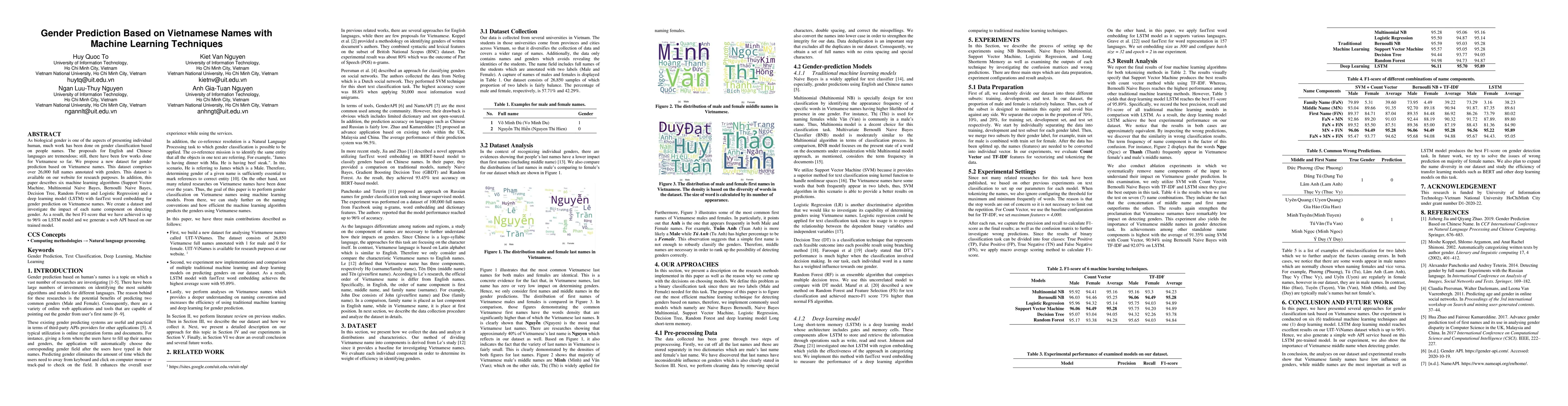 This paper introduces a new dataset for gender prediction based on Vietnamese names, comprising over 26,000 annotated full names, and evaluates six machine learning algorithms along with an LSTM model for gender classification, achieving a best F1-score of 96%. A web API is also generated based on the trained model.