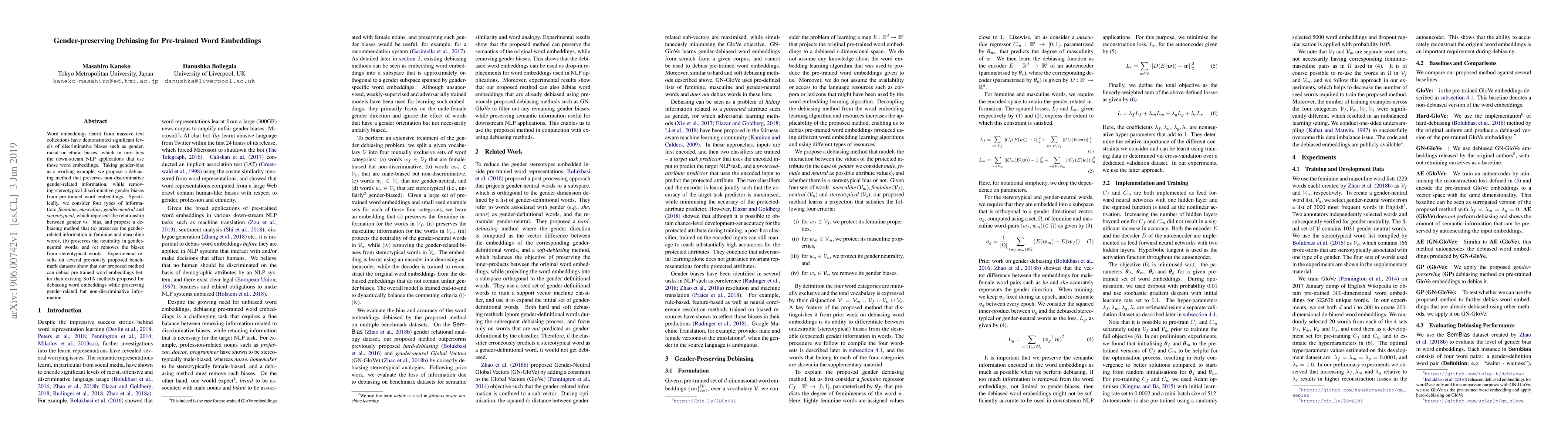 This paper proposes a debiasing method to remove gender biases from pre-trained word embeddings while preserving gender-related, non-discriminatory information. The method effectively distinguishes and treats four types of gender-related information: feminine, masculine, gender-neutral, and stereotypical, outperforming existing debiasing techniques.