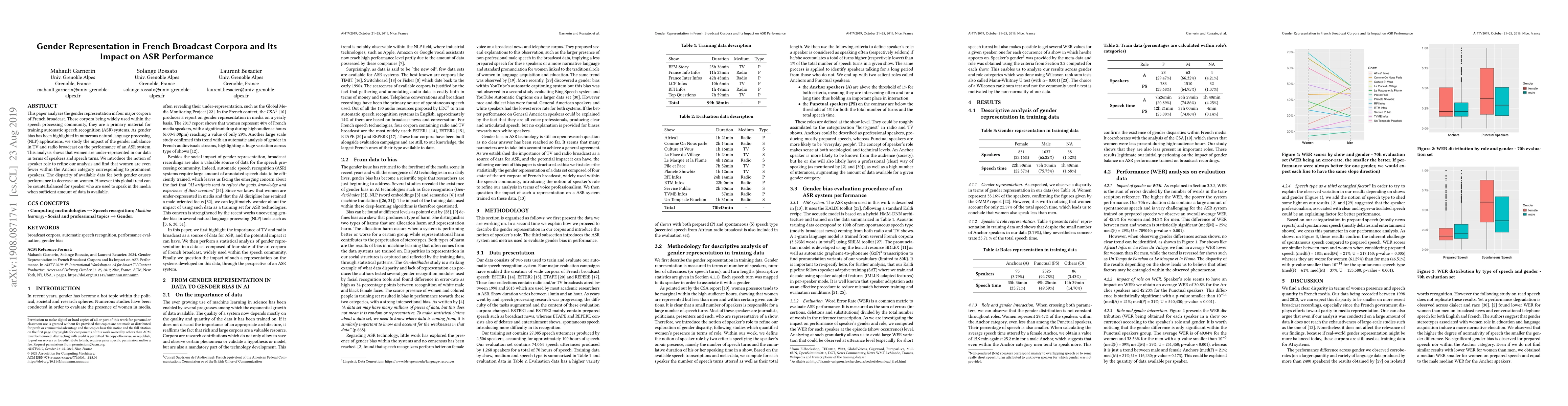 A study analyzes gender representation in French broadcast corpora and finds that women are underrepresented, leading to decreased ASR performance. However, sufficient data can balance this trend for speakers commonly used in the media.