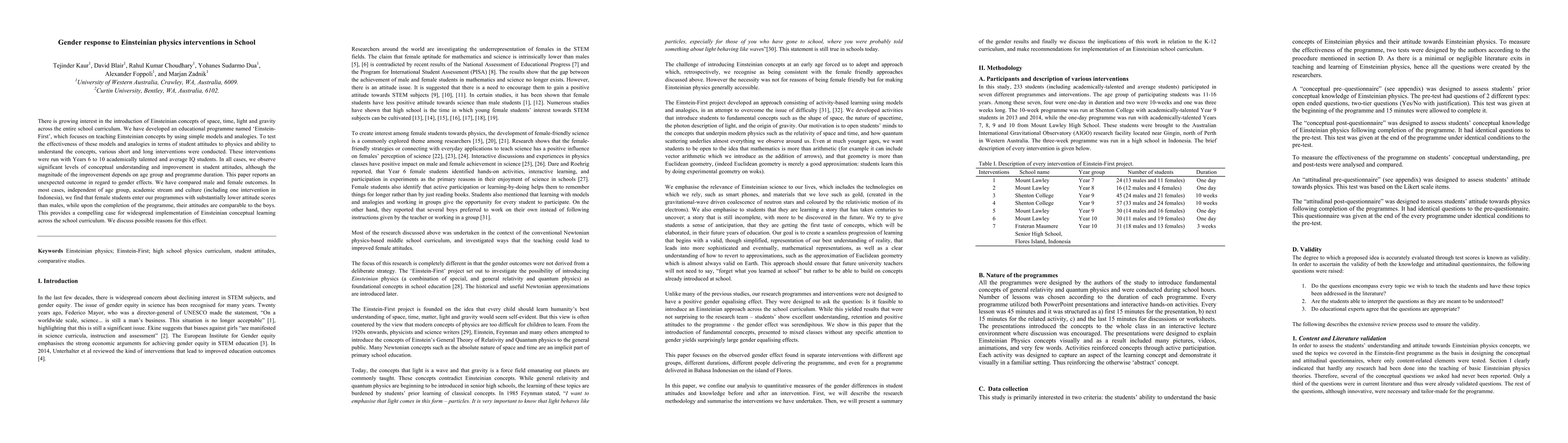 This study evaluates the impact of Einsteinian physics interventions on student attitudes and understanding, showing significant improvements across various age groups. Notably, female students start with lower attitude scores but end up with comparable attitudes to males, suggesting a gender-specific positive effect of the program.