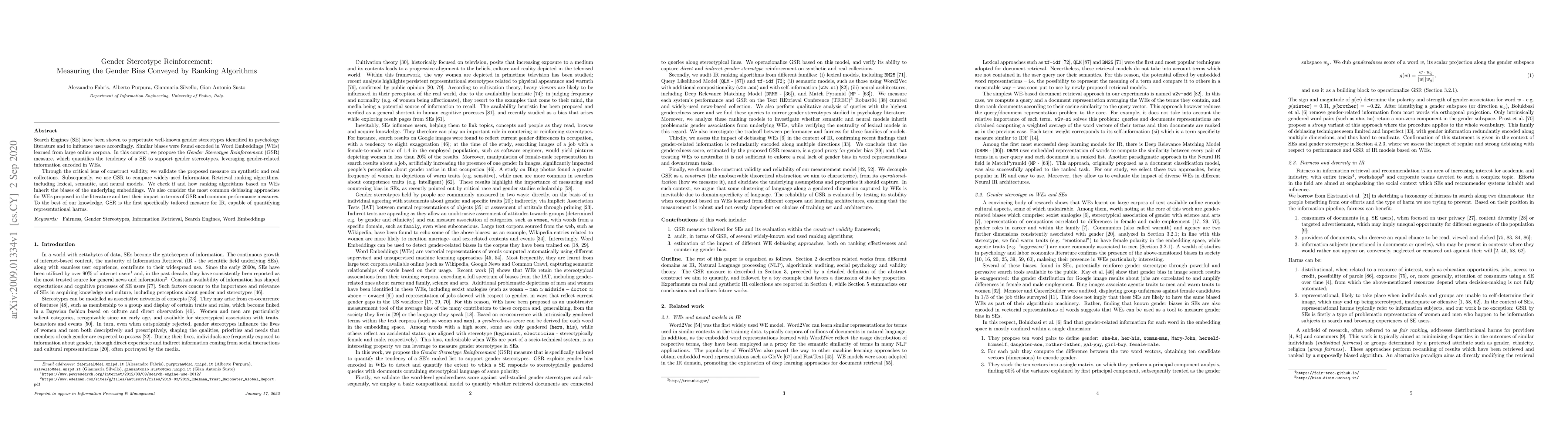 Search Engines (SE) have been shown to perpetuate well-known gender stereotypes identified in psychology literature and to influence users accordingly. Similar biases were found encoded in Word Embeddings (WEs) learned from large online corpora. In this context, we propose the Gender Stereotype Reinforcement (GSR) measure, which quantifies the tendency of a SE to support gender stereotypes, leveraging gender-related information encoded in WEs. Through the critical lens of construct validity, we validate the proposed measure on synthetic and real collections. Subsequently, we use GSR to compare widely-used Information Retrieval ranking algorithms, including lexical, semantic, and neural models. We check if and how ranking algorithms based on WEs inherit the biases of the underlying embeddings. We also consider the most common debiasing approaches for WEs proposed in the literature and test their impact in terms of GSR and common performance measures. To the best of our knowledge, GSR is the first specifically tailored measure for IR, capable of quantifying representational harms.