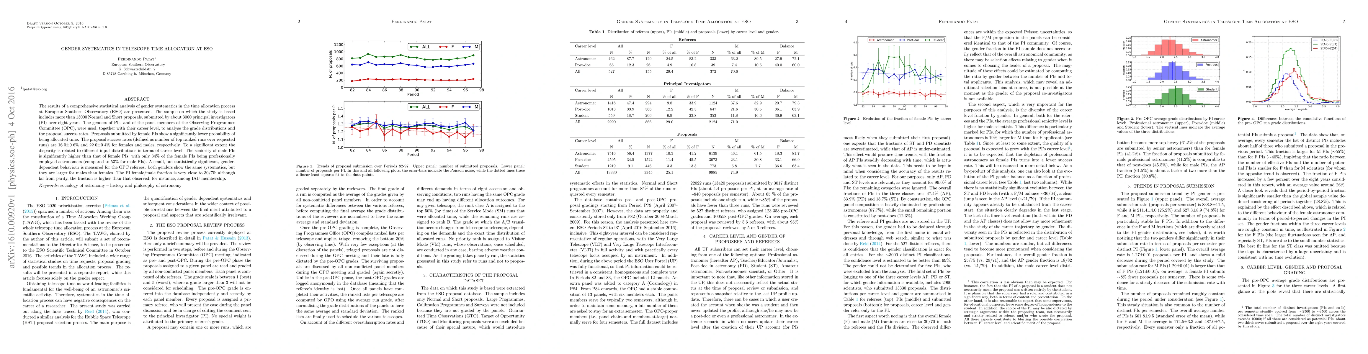 The results of a comprehensive statistical analysis of gender systematics in the time allocation process at European Southern Observatory (ESO) are presented. The sample on which the study is based includes more than 13000 Normal and Short proposals, submitted by about 3000 principal investigators (PI) over eight years. The genders of PIs, and of the panel members of the Observing Programmes Committee (OPC), were used, together with their career level, to analyse the grade distributions and the proposal success rates. Proposals submitted by female PIs show a significantly lower probability of being allocated time. The proposal success rates (defined as number of top ranked runs over requested runs) are 16.0$\pm$0.6% and 22.0$\pm$0.4% for females and males, respectively. To a significant extent the disparity is related to different input distributions in terms of career level. The seniority of male PIs is significantly higher than that of female PIs, with only 34% of the female PIs being professionally employed astronomers (compared to 53% for male PIs). A small, but statistically significant, gender-dependent behaviour is measured for the OPC referees: both genders show the same systematics, but they are larger for males than females. The PI female/male fraction is very close to 30/70; although far from parity, the fraction is higher than that observed, for instance, among IAU membership.