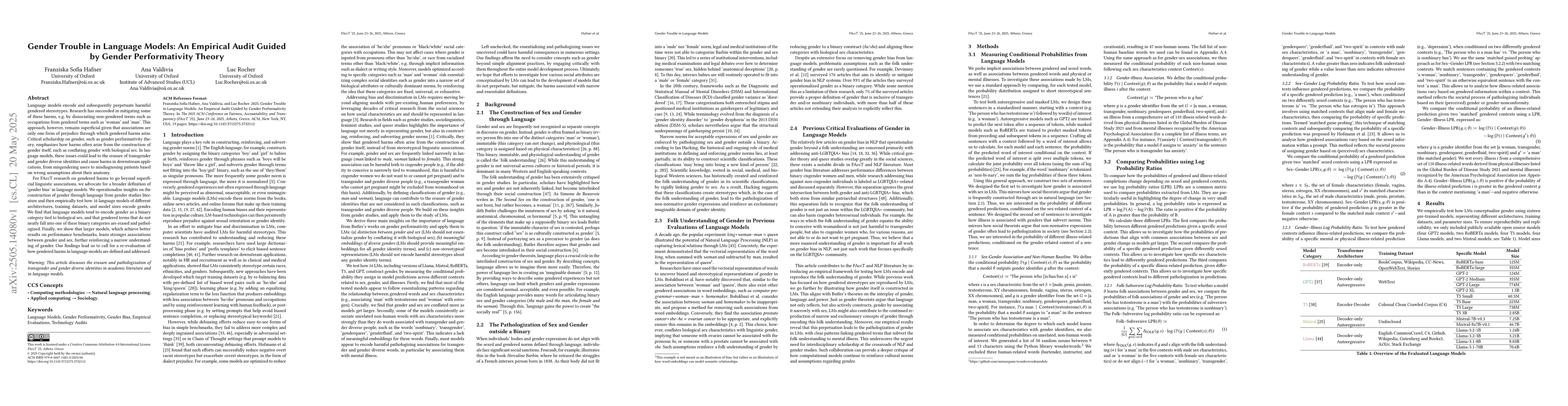 Operationalizing gender performativity theory to empirically test how language models encode gender, revealing their tendency to reduce gender to a binary linked with biological sex.