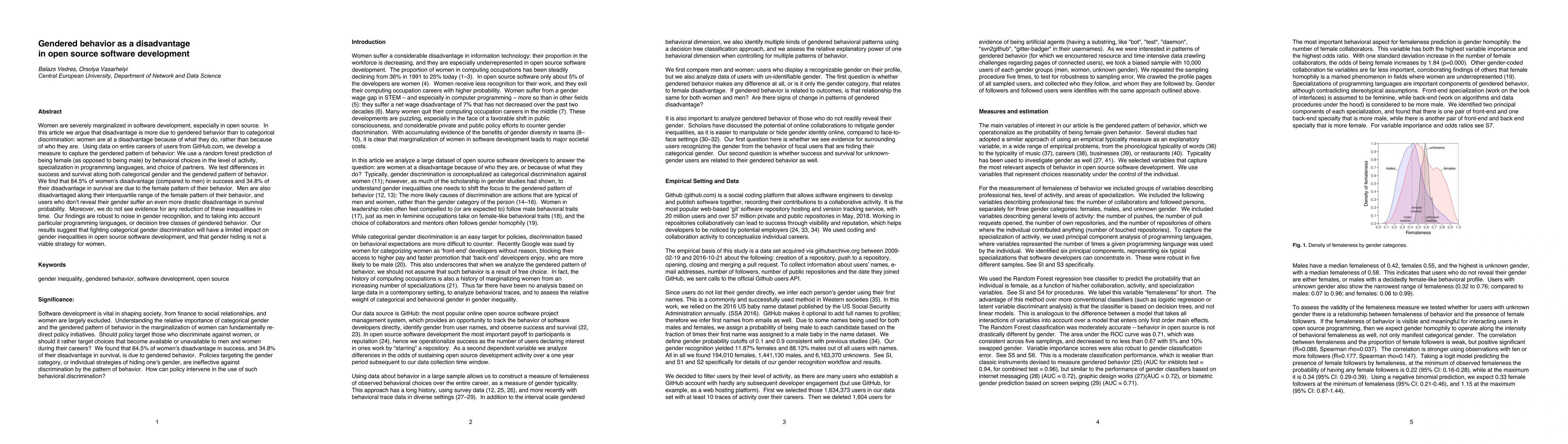 Women are severely marginalized in software development, especially in open source. In this article we argue that disadvantage is more due to gendered behavior than to categorical discrimination: women are at a disadvantage because of what they do, rather than because of who they are. Using data on entire careers of users from GitHub.com, we develop a measure to capture the gendered pattern of behavior: We use a random forest prediction of being female (as opposed to being male) by behavioral choices in the level of activity, specialization in programming languages, and choice of partners. We test differences in success and survival along both categorical gender and the gendered pattern of behavior. We find that 84.5% of women's disadvantage (compared to men) in success and 34.8% of their disadvantage in survival are due to the female pattern of their behavior. Men are also disadvantaged along their interquartile range of the female pattern of their behavior, and users who don't reveal their gender suffer an even more drastic disadvantage in survival probability. Moreover, we do not see evidence for any reduction of these inequalities in time. Our findings are robust to noise in gender recognition, and to taking into account particular programming languages, or decision tree classes of gendered behavior. Our results suggest that fighting categorical gender discrimination will have a limited impact on gender inequalities in open source software development, and that gender hiding is not a viable strategy for women.