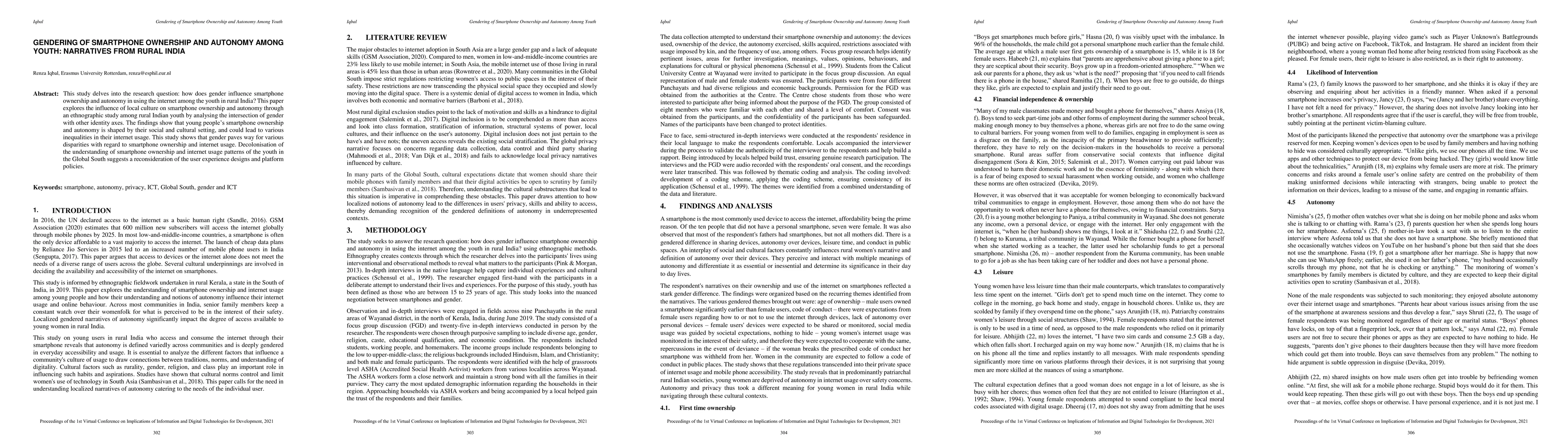 This study delves into the research question: how does gender influence smartphone ownership and autonomy in using the internet among the youth in rural India? This paper explores the influence of local culture on smartphone ownership and autonomy through an ethnographic study among rural Indian youth by analysing the intersection of gender with other identity axes. The findings show that young people's smartphone ownership and autonomy is shaped by their social and cultural setting, and could lead to various inequalities in their internet usage. This study shows that gender paves way for various disparities with regard to smartphone ownership and internet usage. Decolonisation of the understanding of smartphone ownership and internet usage patterns of the youth in the Global South suggests a reconsideration of the user experience designs and platform policies.