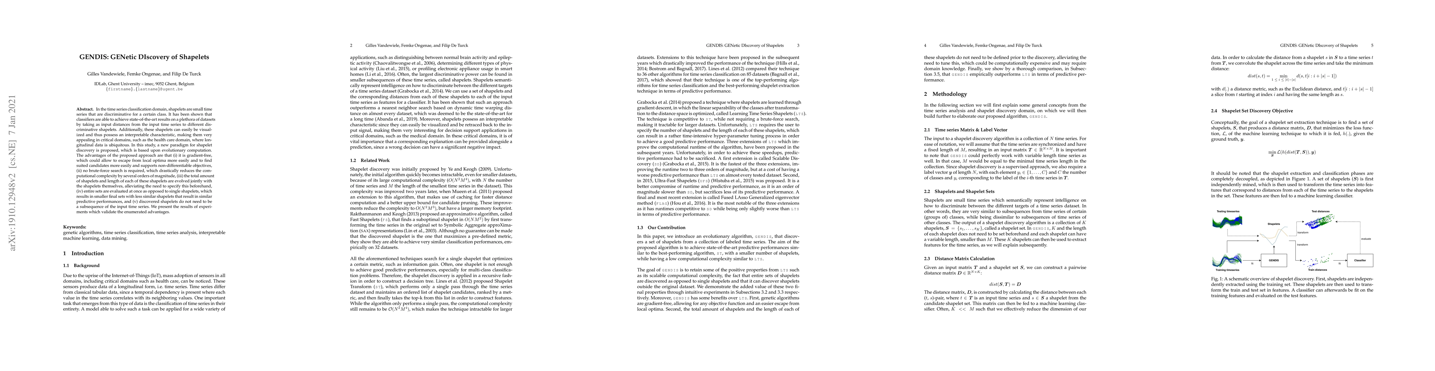 GENDIS proposes an evolutionary computation approach for shapelet discovery in time series classification, offering advantages such as gradient-free optimization, reduced computational complexity, and the discovery of non-subsequence shapelets, validated through experiments demonstrating improved performance.