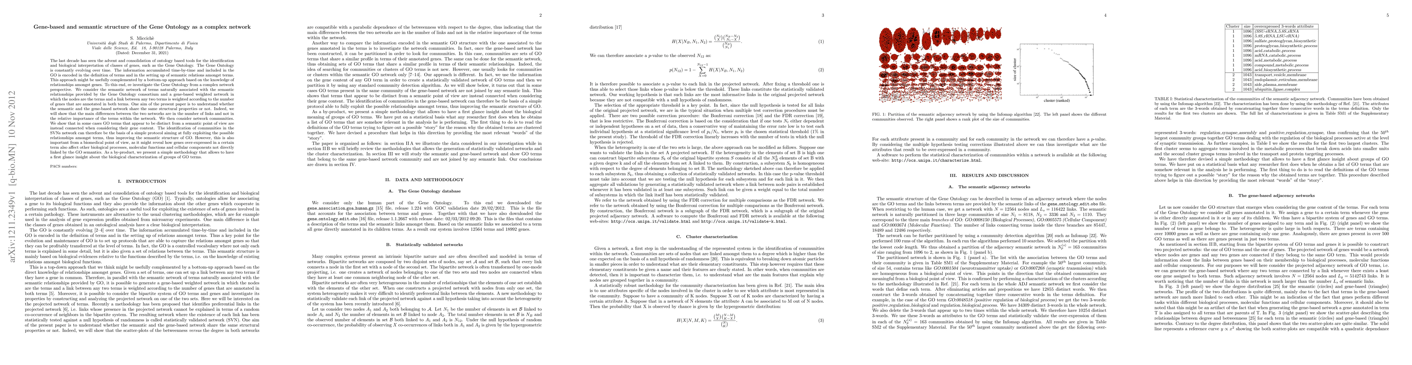 This paper examines the Gene Ontology (GO) from a complex network perspective, comparing its semantic network structure with a gene-based network. It aims to identify whether these networks share structural properties and explores network communities to enhance understanding of GO's semantic structure and reveal indirect biological relationships.