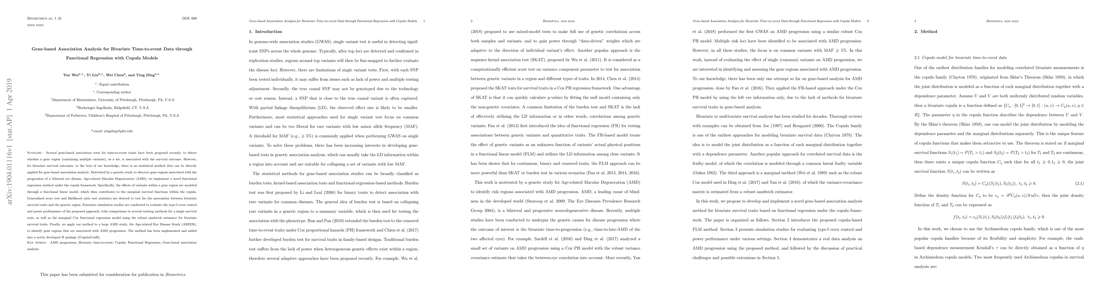 This paper introduces a novel gene-based association analysis method for bivariate time-to-event data using functional regression within a copula framework. The proposed method evaluates gene regions' association with survival outcomes, specifically applied to study Age-related Macular Degeneration (AMD) progression, with extensive simulations and real data validation.