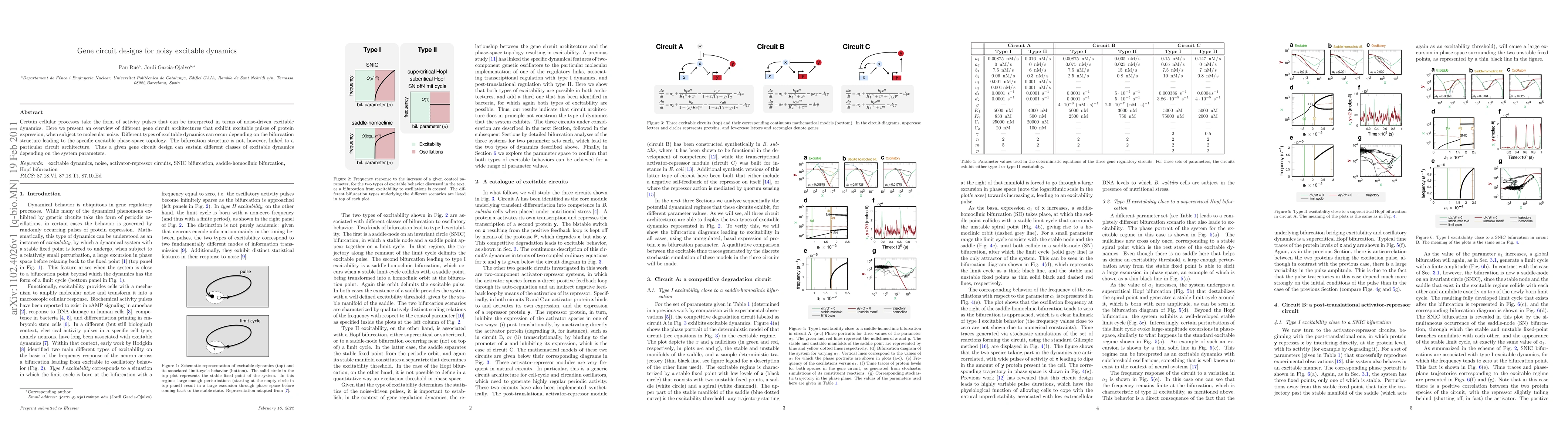 Certain cellular processes take the form of activity pulses that can be interpreted in terms of noise-driven excitable dynamics. Here we present an overview of different gene circuit architectures that exhibit excitable pulses of protein expression, when subject to molecular noise. Different types of excitable dynamics can occur depending on the bifurcation structure leading to the specific excitable phase-space topology. The bifurcation structure is not, however, linked to a particular circuit architecture. Thus a given gene circuit design can sustain different classes of excitable dynamics depending on the system parameters.