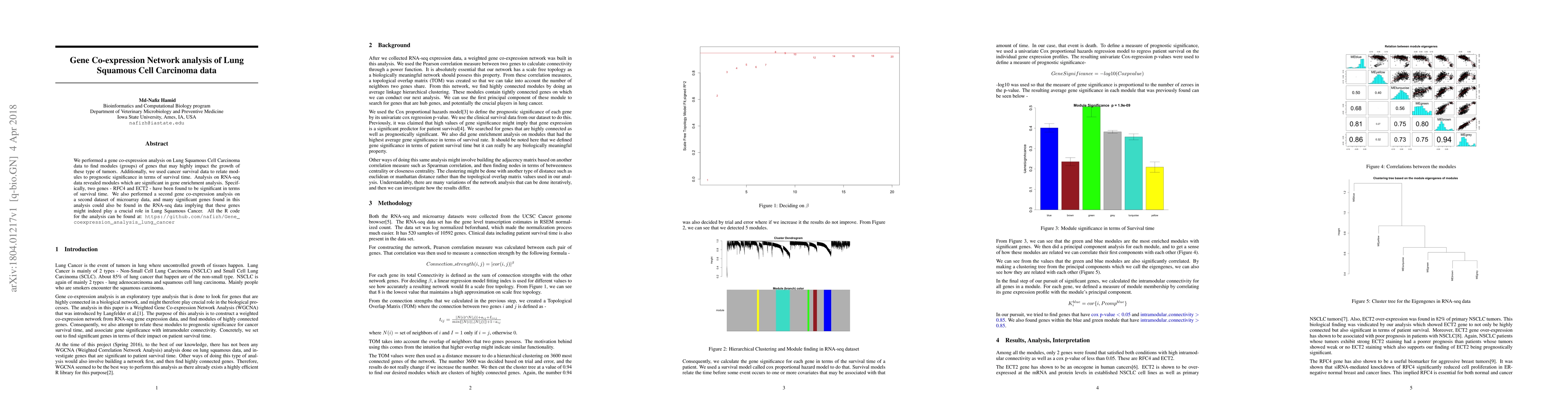 This study conducted gene co-expression network analysis on Lung Squamous Cell Carcinoma data to identify gene modules impacting tumor growth and linked these modules to patient survival. Key findings include significant prognostic roles for RFC4 and ECT2, with corroborative results from a separate microarray dataset.