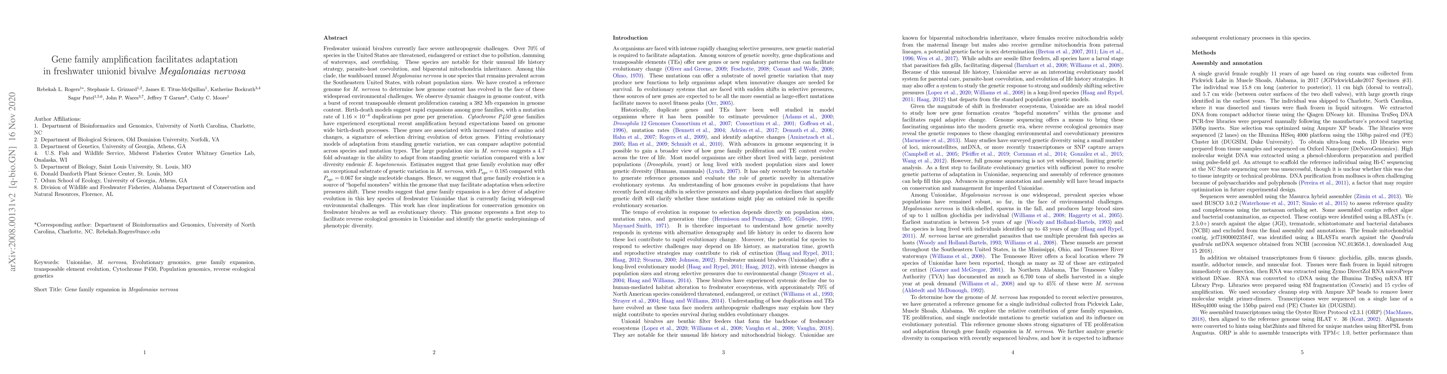 As organisms are faced with intense rapidly changing selective pressures, new genetic material is required to facilitate adaptation. Among sources of genetic novelty, gene duplications and transposable elements (TEs) offer new genes or new regulatory patterns that can facilitate evolutionary change. With advances in genome sequencing it is possible to gain a broader view of how gene family proliferation and TE content evolve in non-model species when populations become threatened. Freshwater bivalves (Unionidae) currently face severe anthropogenic challenges. Over 70% of species in the United States are threatened, endangered or extinct due to pollution, damming of waterways, and overfishing. We have created a reference genome for M. nervosa to determine how genome content has evolved in the face of these widespread environmental challenges. We observe a burst of recent transposable element proliferation causing a 382 Mb expansion in genome content. Gene family expansion is common, with a duplication rate of 1.16 x 10^-8 per gene per generation. Cytochrome P450, ABC transporters, Hsp70 genes, von Willebrand proteins, chitin metabolism genes, mitochondria eating proteins, and opsin gene families have experienced significantly greater amplification and show signatures of selection. We use evolutionary theory to assess the relative contribution of SNPs and duplications in evolutionary change. Estimates suggest that gene family evolution may offer an exceptional substrate of genetic variation in M. nervosa, with Psgv=0.185 compared with Psgv=0.067 for single nucleotide changes. Hence, we suggest that gene family evolution is a source of "hopeful monsters" within the genome that facilitate adaptation.