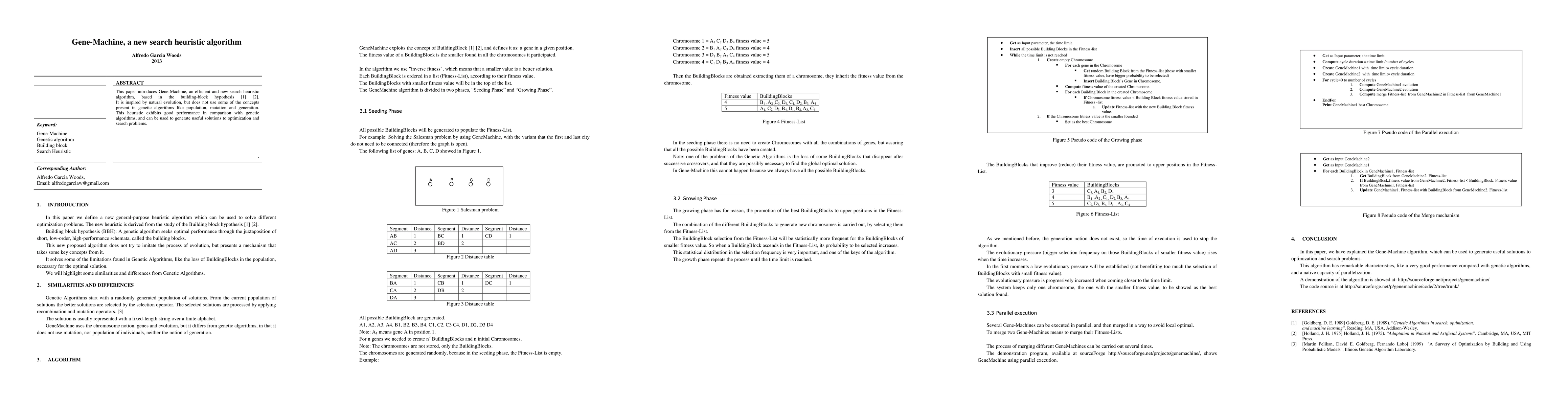 This paper introduces Gene-Machine, an efficient and new search heuristic algorithm, based in the building-block hypothesis. It is inspired by natural evolution, but does not use some of the concepts present in genetic algorithms like population, mutation and generation. This heuristic exhibits good performance in comparison with genetic algorithms, and can be used to generate useful solutions to optimization and search problems.
