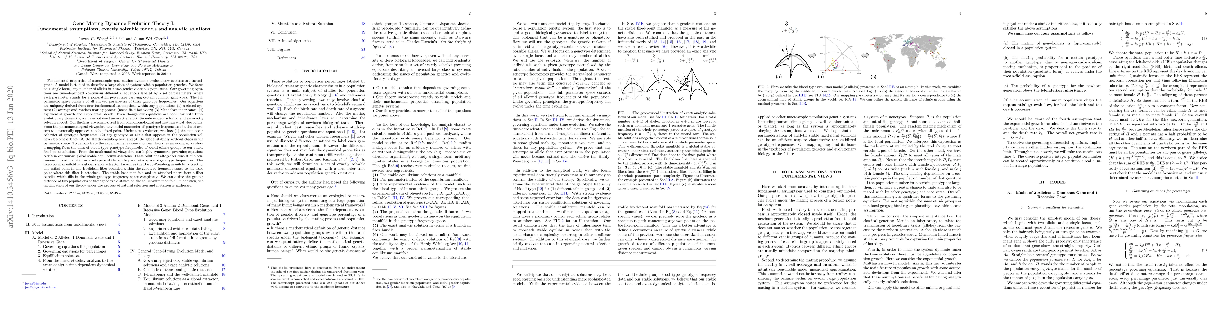 Fundamental properties of macroscopic gene-mating dynamic evolutionary systems are investigated. We focus on a single locus, any number of alleles in a two-gender dioecious population, for a large class of systems within population genetics. Our governing equations are time-dependent differential equations labeled by a set of genotype frequencies. Our equations are uniquely derived from 4 assumptions within any population: (1) a closed system; (2) average-and-random mating process (mean-field behavior); (3) Mendelian inheritance; (4) exponential growth/death. Although our equations are nonlinear with time-evolutionary dynamics, we have obtained an exact analytic time-dependent solution and an exactly solvable model. From the phenomenological viewpoint, any initial parameter of genotype frequencies of a closed system will eventually approach a stable fixed point. Under time evolution, we show (1) the monotonic behavior of genotype frequencies, (2) any genotype or allele that appears in the population will never become extinct, (3) the Hardy-Weinberg law, and (4) the global stability without chaos in the parameter space. To demonstrate the experimental evidence for our theory, as an example, we show a mapping from the data of blood type genotype frequencies of world ethnic groups to our stable fixed-point solutions. This fixed-point Hardy-Weinberg manifold, attracting any initial point in any Euclidean fiber bounded within the genotype frequency space to the fixed point where this fiber is attached. The stable base manifold and its attached fibers form a fiber bundle, which fills in the whole genotype frequency space completely. We can define the genetic distance of two populations as their geodesic distance on the equilibrium manifold. The modification of our theory under the process of natural selection and mutation is addressed.