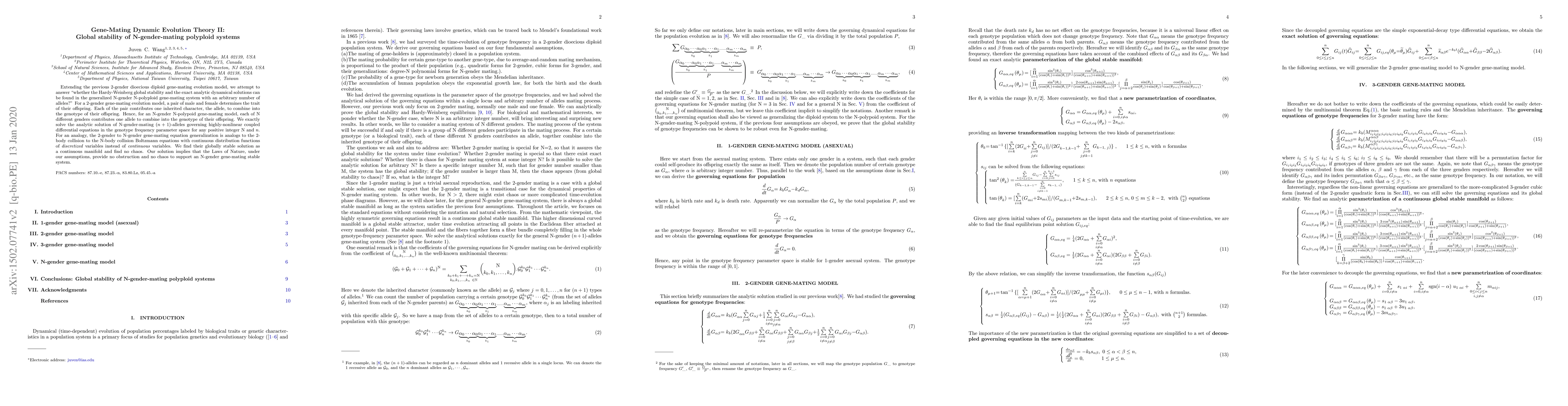 Extending the previous 2-gender dioecious diploid gene-mating evolution model [arXiv:1410.3456], we attempt to answer "whether the Hardy-Weinberg global stability and the exact analytic dynamical solutions can be found in the generalized N-gender N-polyploid gene-mating system with an arbitrary number of alleles?" For a 2-gender gene-mating evolution model, a pair of male and female determines the trait of their offspring. Each of the pair contributes one inherited character, the allele, to combine into the genotype of their offspring. Hence, for an N-gender N-polypoid gene-mating model, each of N different genders contributes one allele to combine into the genotype of their offspring. We exactly solve the analytic solution of N-gender-mating $(n+1)$-alleles governing highly-nonlinear coupled differential equations in the genotype frequency parameter space for any positive integer N and $n$. For an analogy, the 2-gender to N-gender gene-mating equation generalization is analogs to the 2-body collision to the N-body collision Boltzmann equations with continuous distribution functions of "discretized" variables instead of "continuous" variables. We find their globally stable solution as a continuous manifold and find no chaos. Our solution implies that the Laws of Nature, under our assumptions, provide no obstruction and no chaos to support an N-gender gene-mating stable system.