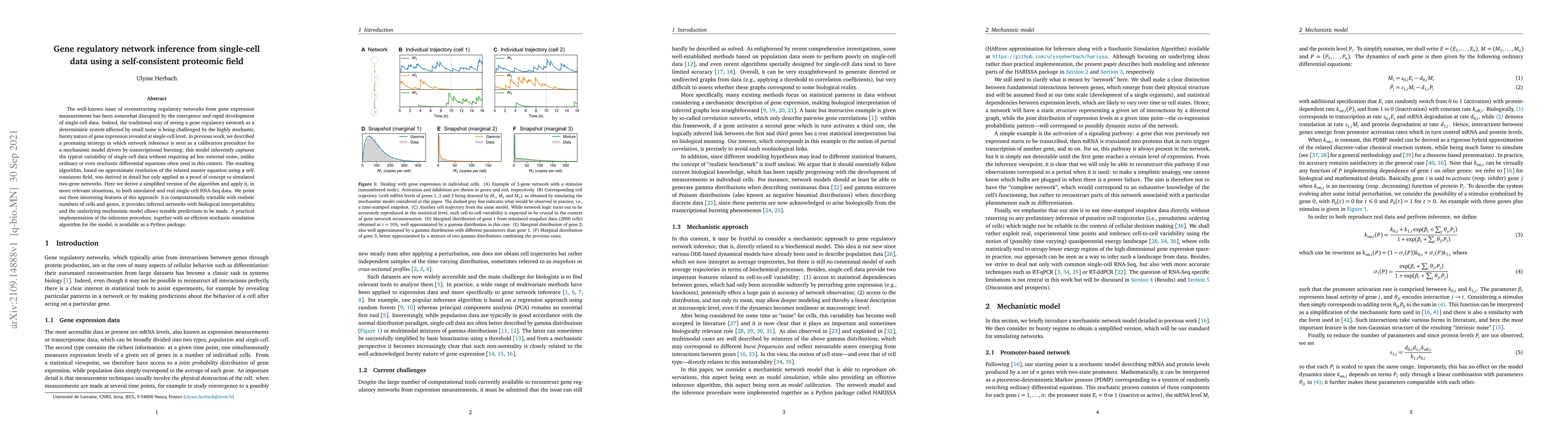 The research introduces a simplified version of a mechanistic model of gene regulatory networks, formulated as a hybrid, piecewise-deterministic Markov process (PDMP) involving mRNA and protein levels. It uses a self-consistent proteomic field (SCPF) approximation to develop an inference algorithm, implemented as a Python package called HARISSA.
