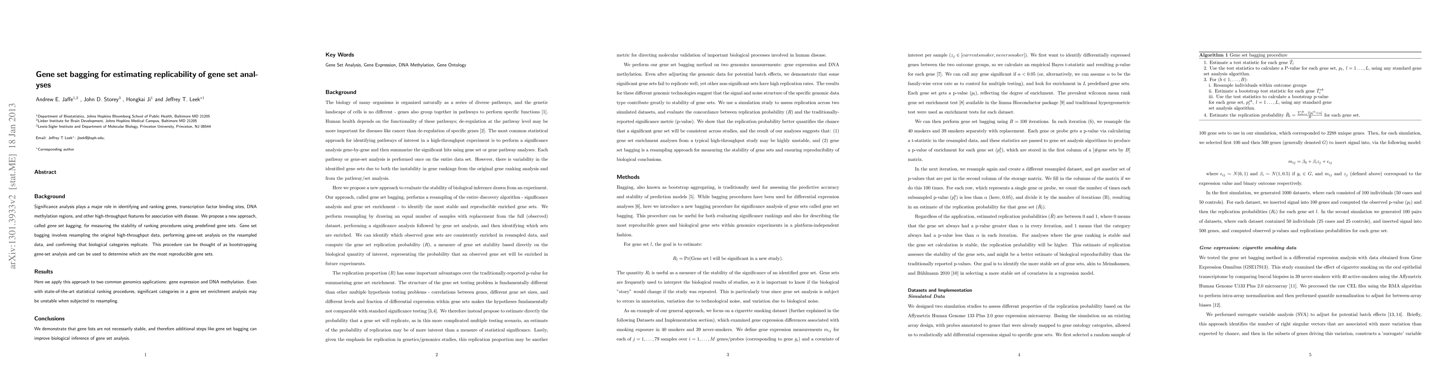The paper introduces gene set bagging, a method to assess the replicability of gene set analyses by resampling data and confirming biological category stability. The approach is applied to gene expression and DNA methylation data, revealing that significant gene sets may lack stability, thus underscoring the need for enhanced reproducibility measures like gene set bagging.