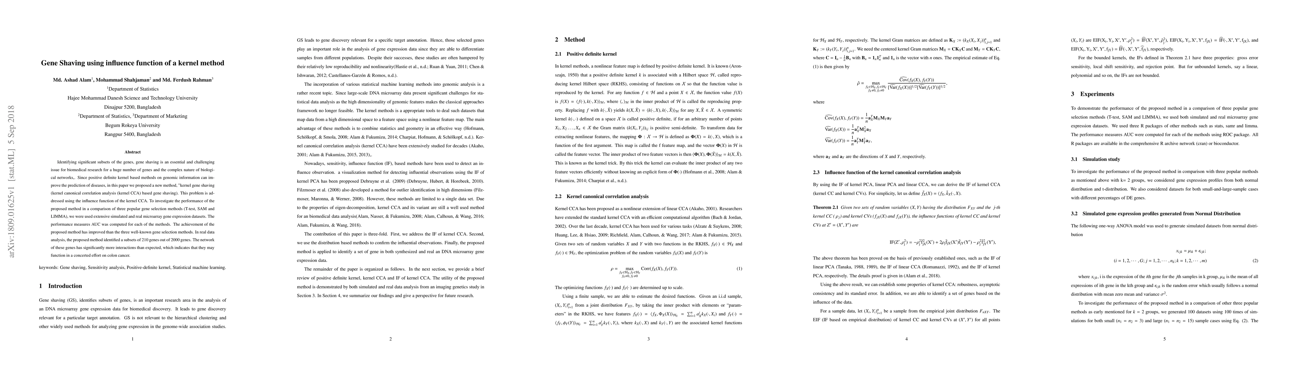 This paper proposes a new kernel gene shaving method based on kernel canonical correlation analysis (kernel CCA) using the influence function to identify significant gene subsets for disease prediction. The method outperforms T-test, SAM, and LIMMA in both simulated and real microarray datasets, identifying 210 functionally interacting genes in colon cancer.