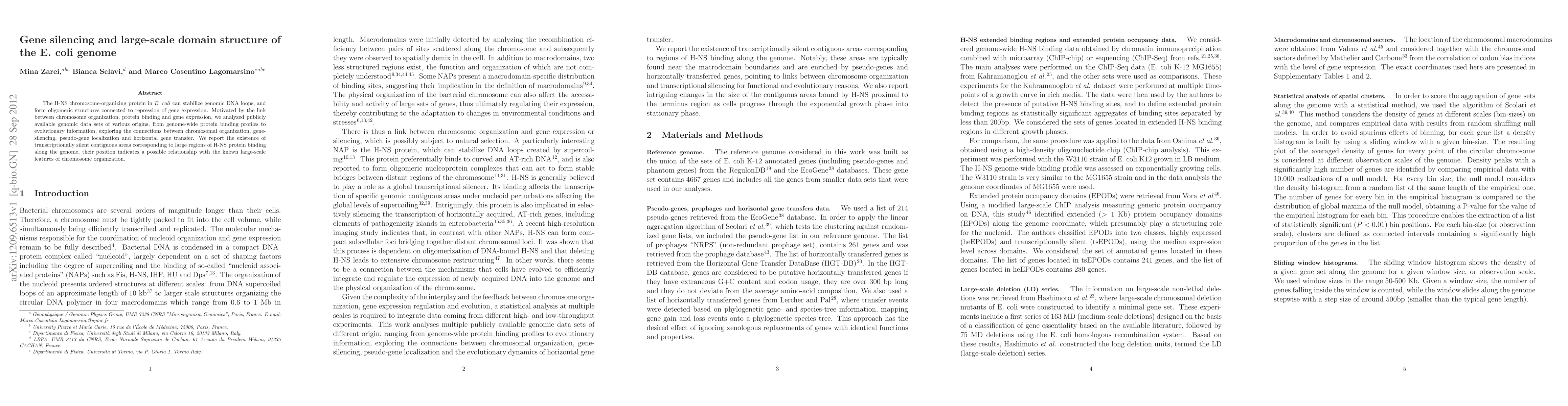 This paper investigates the role of the H-NS protein in E. coli, linking its large-scale binding along the genome to transcriptional silencing and chromosomal organization. The study reveals extensive regions of gene silencing corresponding to H-NS protein binding, suggesting a relationship with the genome's structural features.