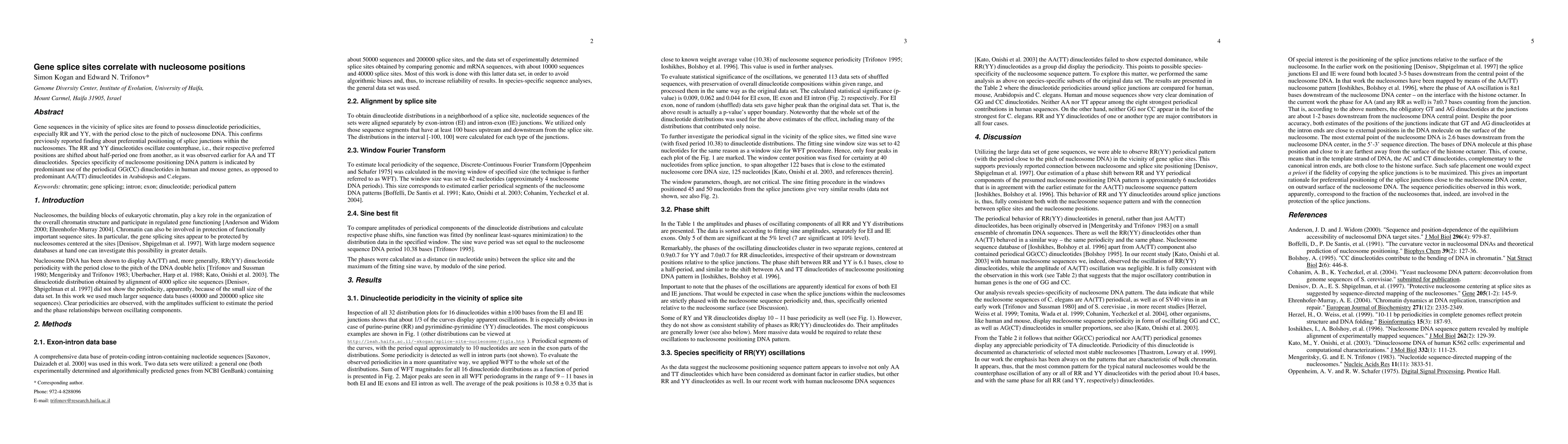 Gene sequences in the vicinity of splice sites are found to possess dinucleotide periodicities, especially RR and YY, with the period close to the pitch of nucleosome DNA. This confirms previously reported finding about preferential positioning of splice junctions within the nucleosomes. The RR and YY dinucleotides oscillate counterphase, i.e., their respective preferred positions are shifted about half-period one from another, as it was observed earlier for AA and TT dinucleotides. Species specificity of nucleosome positioning DNA pattern is indicated by predominant use of the periodical GG(CC) dinucleotides in human and mouse genes, as opposed to predominant AA(TT) dinucleotides in Arabidopsis and C.elegans. Keywords: chromatin; gene splicing; intron; exon; dinucleotide; periodical pattern