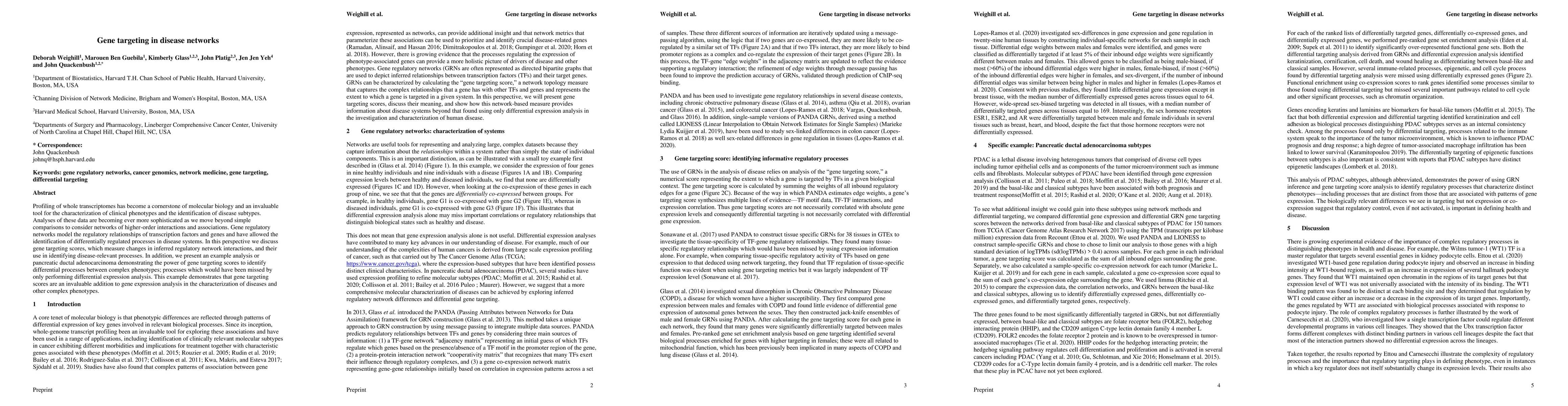 Profiling of whole transcriptomes has become a cornerstone of molecular biology and an invaluable tool for the characterization of clinical phenotypes and the identification of disease subtypes. Analyses of these data are becoming ever more sophisticated as we move beyond simple comparisons to consider networks of higher-order interactions and associations. Gene regulatory networks model the regulatory relationships of transcription factors and genes and have allowed the identification of differentially regulated processes in disease systems. In this perspective we discuss gene targeting scores, which measure changes in inferred regulatory network interactions, and their use in identifying disease-relevant processes. In addition, we present an example analysis or pancreatic ductal adenocarcinoma demonstrating the power of gene targeting scores to identify differential processes between complex phenotypes; processes which would have been missed by only performing differential expression analysis. This example demonstrates that gene targeting scores are an invaluable addition to gene expression analysis in the characterization of diseases and other complex phenotypes.