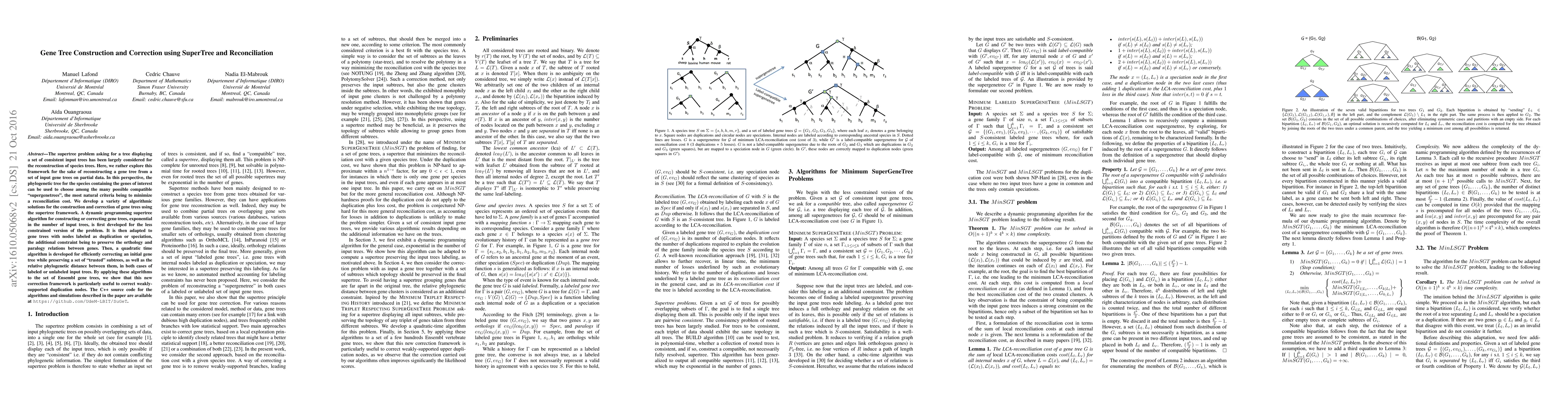 This paper develops algorithms for constructing and correcting gene trees using the supertree framework, focusing on reconciling gene trees with species trees to minimize reconciliation costs. It introduces dynamic programming and quadratic time algorithms for preserving orthology and paralogy relations, and demonstrates the utility of these methods in correcting weakly supported duplication nodes.
