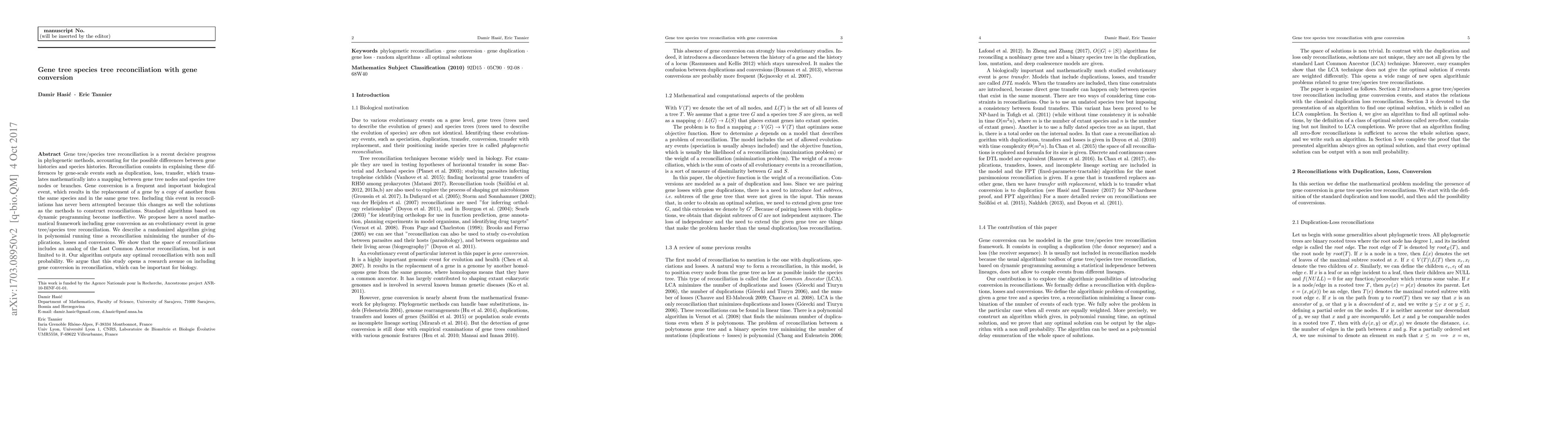 This paper introduces a novel mathematical framework for reconciling gene trees with species trees, incorporating gene conversion as an evolutionary event. The authors propose a randomized algorithm that efficiently finds an optimal reconciliation minimizing duplications, losses, and conversions, demonstrating its effectiveness and potential significance for biological research.