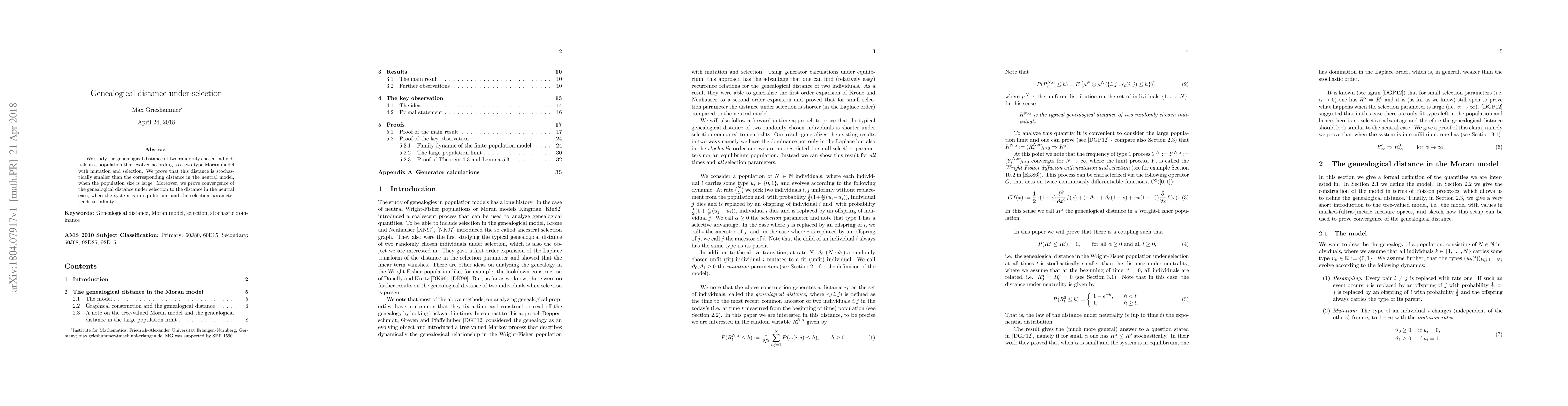 This paper investigates the genealogical distance between two individuals in a population evolving under a two-type Moran model with selection and mutation. It demonstrates that the distance under selection is stochastically smaller than in the neutral model for large populations, and converges to the neutral distance as selection strength increases indefinitely.