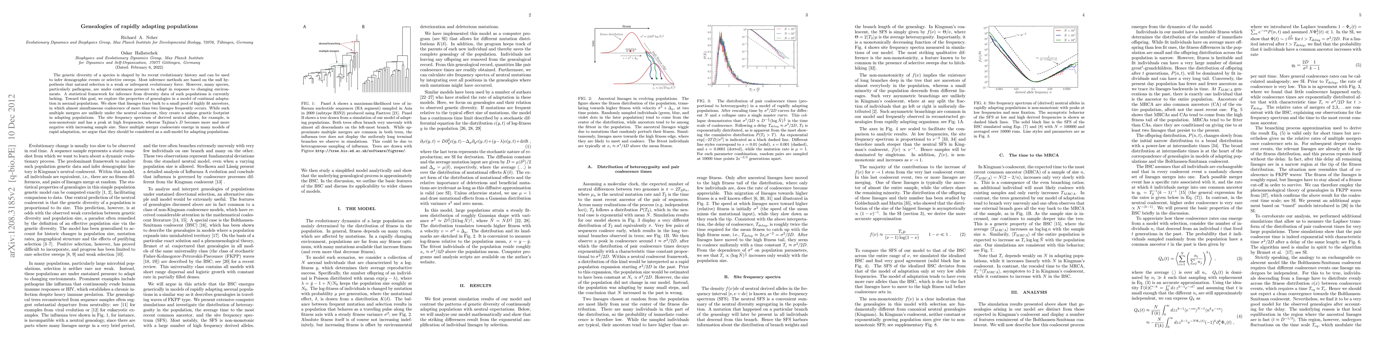 This paper develops a statistical framework for understanding genetic diversity in rapidly adapting populations, particularly pathogens, by exploring the properties of genealogies under continual adaptation. It finds that frequent multiple mergers of lineages create a unique genetic footprint, leading to a non-monotonic site frequency spectrum and increasingly negative Tajima's D, suggesting these patterns should serve as a null model for such populations.