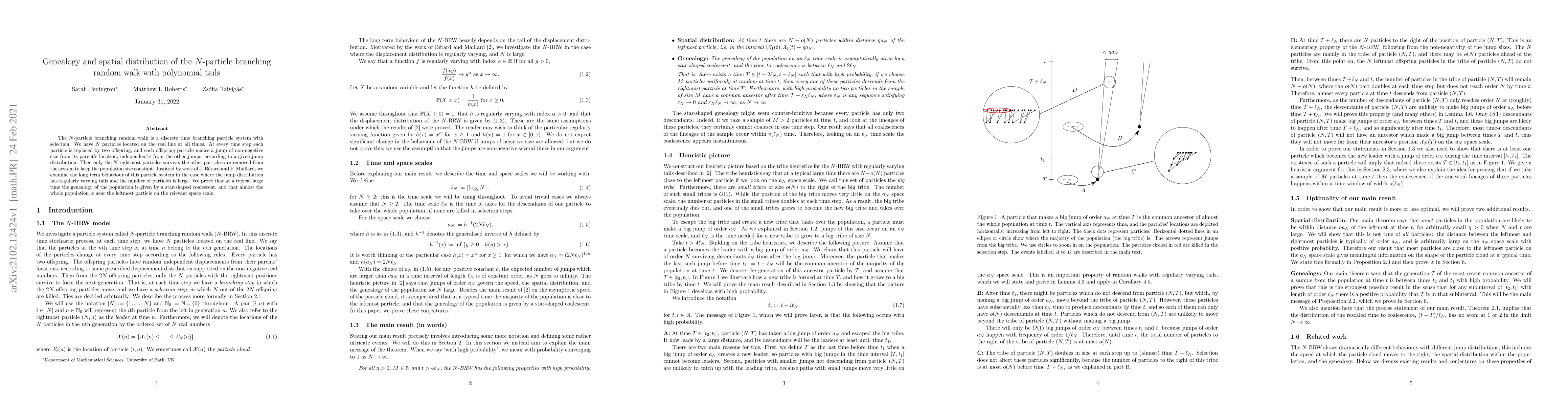 The $N$-particle branching random walk is a discrete time branching particle system with selection. We have $N$ particles located on the real line at all times. At every time step each particle is replaced by two offspring, and each offspring particle makes a jump of non-negative size from its parent's location, independently from the other jumps, according to a given jump distribution. Then only the $N$ rightmost particles survive; the other particles are removed from the system to keep the population size constant. Inspired by work of J. B\'erard and P. Maillard, we examine the long term behaviour of this particle system in the case where the jump distribution has regularly varying tails and the number of particles is large. We prove that at a typical large time the genealogy of the population is given by a star-shaped coalescent, and that almost the whole population is near the leftmost particle on the relevant space scale.