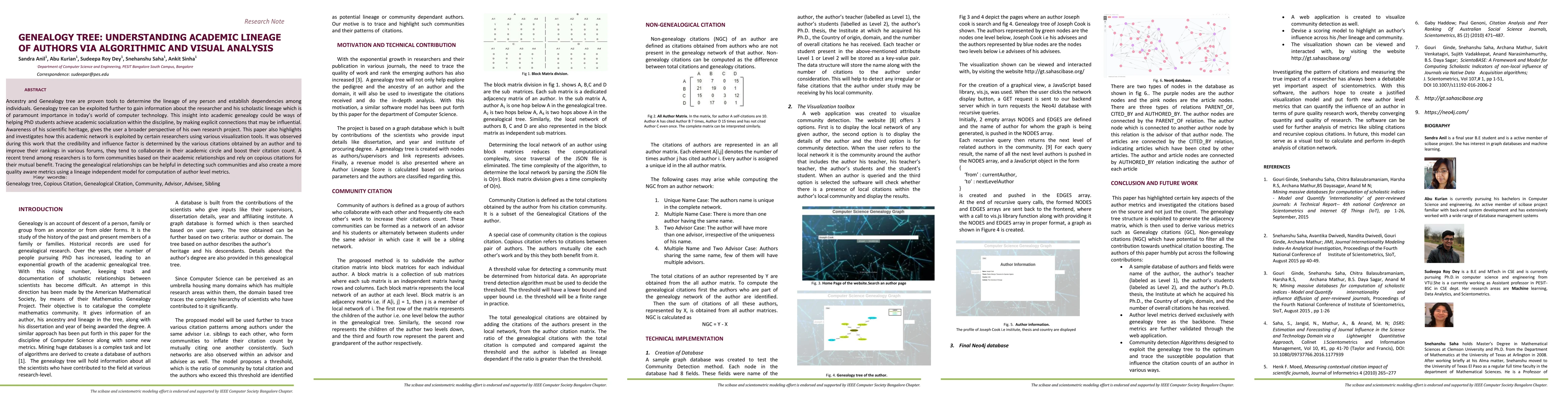 This paper explores the use of genealogy tree algorithms and visual analysis to map academic lineage and influence among researchers, emphasizing the role of citations in determining credibility and the trend of forming collaborative communities based on academic relationships. It proposes a lineage-independent model for computing author-level metrics to enhance the quality of academic evaluations.